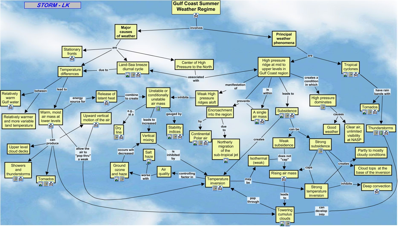 This Concept Map, created with IHMC CmapTools, has information related to: Summer Weather Regime, High pressure ridge at mid to upper levels in Gulf Coast region manifestation of Weak High pressure ridges aloft, Warm, moist air mass at lower levels can produce Upper level cloud decks, Major causes of weather are Land-Sea breeze diurnal cycle, Unstable or conditionally unstable air mass e.g., at a Dry line, Principal weather phenomena are High pressure ridge at mid to upper levels in Gulf Coast region, Rising air mass leads to Towering cumulus clouds, Subsidence can be Strong subsidence, Encroachment into the region due to Northerly migration of the sub-tropical jet, High pressure ridge at mid to upper levels in Gulf Coast region creates a condition in which High pressure dominates, Tropical cyclones have rain bands with Thunderstorms, Warm, moist air mass at lower levels can produce Upward vertical motion of the air, High pressure ridge at mid to upper levels in Gulf Coast region prevents Encroachment into the region, Strong subsidence caps Rising air mass, Isothermal (weak) does not "cap" Rising air mass, Upward vertical motion of the air allow the air to "pop thru" a weak Temperature inversion, High pressure dominates causes Good weather, Gulf Coast Summer Weather Regime involves Principal weather phenomena, Encroachment into the region by Continental Polar air, Towering cumulus clouds pop through Temperature inversion, Air quality worse with Salt haze