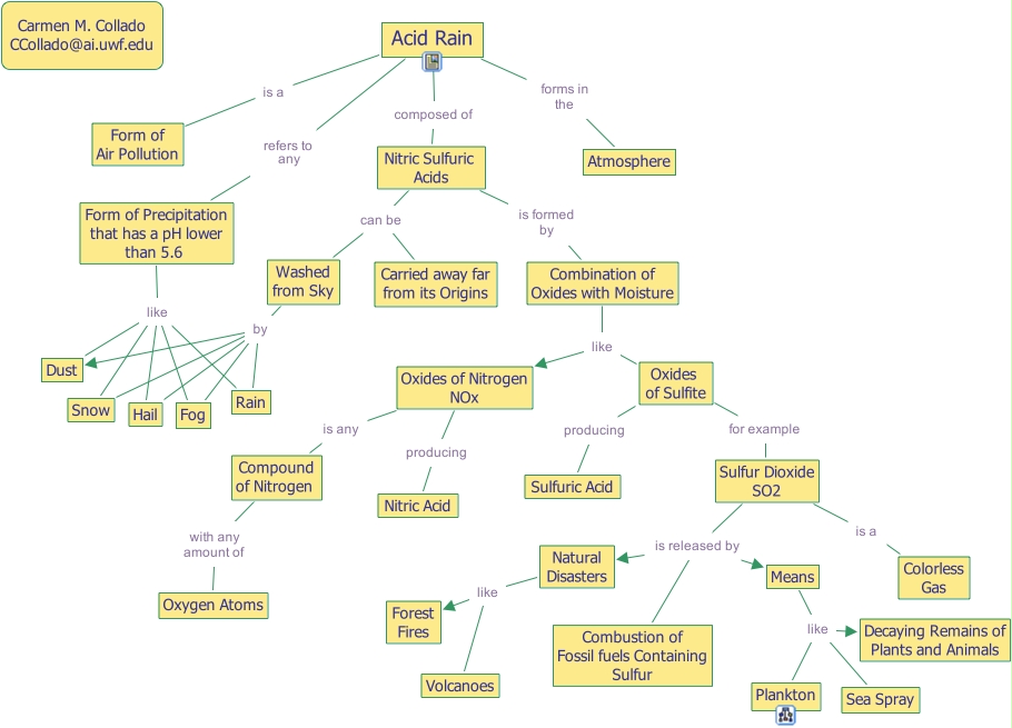 acid rain, form of precipitation that has a ph lower than 5.6 , carmen m. collado ccollado@ai.uwf.edu, atmosphere, dust, colorless gas, acid rain, sulfuric acid, nitric sulfuric acids, nitric acid, combustion of fossil fuels containing sulfur, oxygen atoms, snow, oxides of sulfite, decaying remains of plants and animals, natural disasters, plankton, sea spray, carried away far from its origins, sulfur dioxide so2, fog, form of air pollution, volcanoes, oxides of nitrogen nox, rain, forest fires, means, combination of oxides with moisture, washed from sky, compound of nitrogen , hail