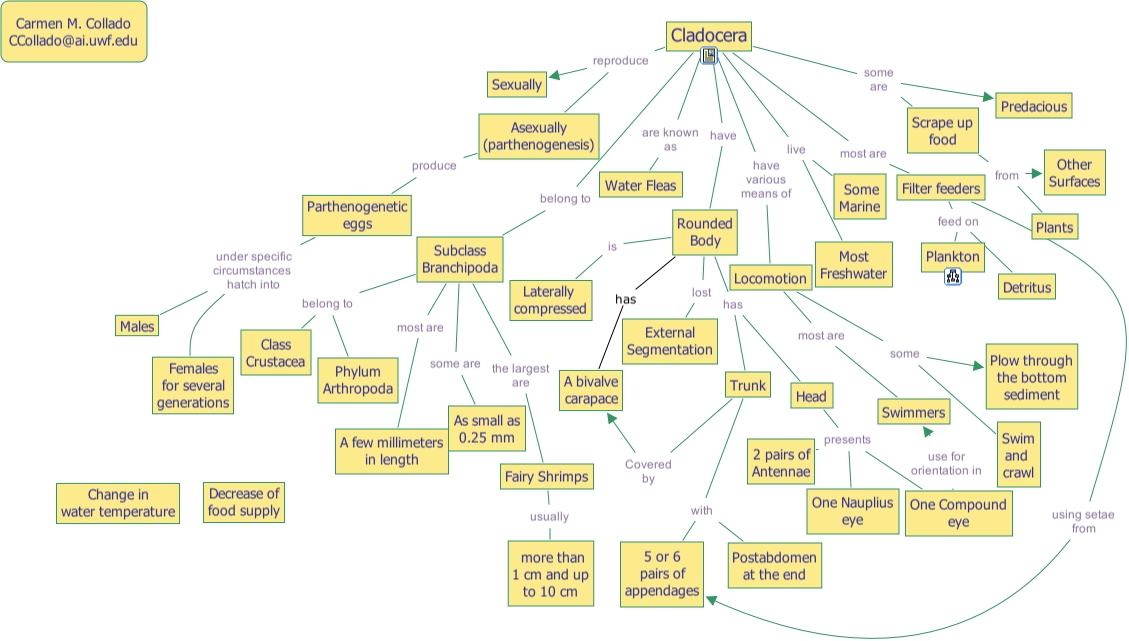 Cladocera belong to Subclass Branchipoda, Head presents One Compound eye, Head presents 2 pairs of Antennae, Head presents One Nauplius eye, Locomotion some Plow through the bottom sediment, Locomotion some Swim and crawl, Cladocera live Most Freshwater, Cladocera live Some Marine, Subclass Branchipoda belong to Class Crustacea, Subclass Branchipoda belong to Phylum Arthropoda, Asexually (parthenogenesis) produce Parthenogenetic eggs, Parthenogenetic eggs under specific circumstances hatch into Females for several generations, Parthenogenetic eggs under specific circumstances hatch into Males, Fairy Shrimps usually more than 1 cm and up to 10 cm, Trunk Covered by A bivalve carapace, Rounded Body is Laterally compressed, Subclass Branchipoda the largest are Fairy Shrimps, Subclass Branchipoda some are As small as 0.25 mm, Cladocera have Rounded Body, Subclass Branchipoda most are A few millimeters in length, Trunk with 5 or 6 pairs of appendages, Trunk with Postabdomen at the end, Cladocera some are Predacious, Cladocera some are Scrape up food, Scrape up food from Plants, Scrape up food from Other Surfaces, Cladocera most are Filter feeders, Cladocera reproduce Asexually (parthenogenesis), Cladocera reproduce Sexually, Cladocera have various means of Locomotion, One Compound eye use for orientation in Swimmers, Rounded Body has Head, Rounded Body has Trunk, Cladocera are known as Water Fleas, Filter feeders using setae from 5 or 6 pairs of appendages, Rounded Body lost External Segmentation, Filter feeders feed on Detritus, Filter feeders feed on Plankton, Locomotion most are Swimmers, Rounded Body has A bivalve carapace