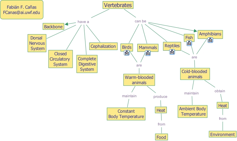 Fish are Cold-blooded animals, Vertebrates can be Mammals, Vertebrates can be Reptiles, Vertebrates can be Amphibians, Vertebrates can be Fish, Vertebrates can be Birds, Warm-blooded animals maintain Constant Body Temperature, Heat from Environment, Cold-blooded animals obtain Heat, Heat from Food, Mammals are Warm-blooded animals, Cold-blooded animals maintain Ambient Body Temperature, Amphibians are Cold-blooded animals, Birds are Warm-blooded animals, Warm-blooded animals produce Heat, Reptiles are Cold-blooded animals, Vertebrates have a Complete Digestive System, Vertebrates have a Closed Circulatory System, Vertebrates have a Cephalization, Vertebrates have a Backbone, Vertebrates have a Dorsal Nervous System