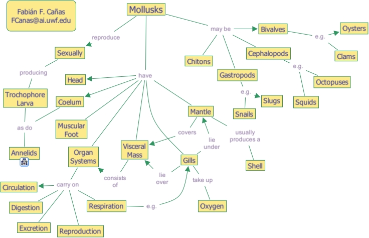 Respiration e.g. Gills, Mollusks have Coelum, Mollusks have Gills, Mollusks have Organ Systems, Mollusks have Muscular Foot, Mollusks have Mantle, Mollusks have Visceral Mass, Mollusks have Head, Gills lie over Visceral Mass, Mollusks may be Cephalopods, Mollusks may be Gastropods, Mollusks may be Chitons, Mollusks may be Bivalves, Cephalopods e.g. Squids, Cephalopods e.g. Octopuses, Gills take up Oxygen, Mantle covers Visceral Mass, Mantle usually produces a Shell, Gills lie under Mantle, Sexually producing Trochophore Larva, Visceral Mass consists of Organ Systems, Gastropods e.g. Snails, Gastropods e.g. Slugs, Bivalves e.g. Oysters, Bivalves e.g. Clams, Organ Systems carry on Circulation, Organ Systems carry on Reproduction, Organ Systems carry on Respiration, Organ Systems carry on Excretion, Organ Systems carry on Digestion, Mollusks reproduce Sexually, Trochophore Larva as do Annelids, Coelum as do Annelids