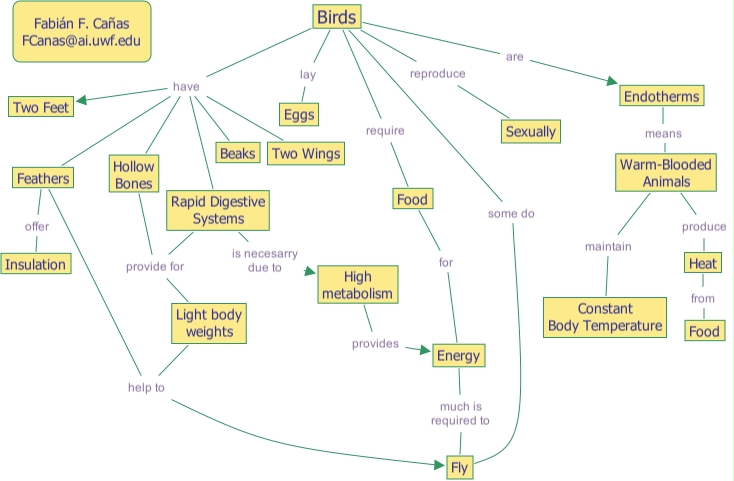 Feathers help to Fly, Food for Energy, Birds reproduce Sexually, Birds require Food, Heat from Food, Light body weights help to Fly, Endotherms means Warm-Blooded Animals, Warm-Blooded Animals produce Heat, Birds are Endotherms, Birds some do Fly, Birds have Feathers, Birds have Two Feet, Birds have Hollow Bones, Birds have Beaks, Birds have Rapid Digestive Systems, Birds have Two Wings, Feathers offer Insulation, Rapid Digestive Systems is necesarry due to High metabolism, Hollow Bones provide for Light body weights, High metabolism provides Energy, Energy much is required to Fly, Warm-Blooded Animals maintain Constant Body Temperature, Rapid Digestive Systems provide for Light body weights, Birds lay Eggs