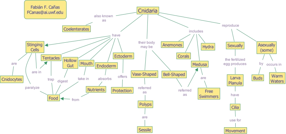 Medusa are Free Swimmers, Cilia use for Movement, Hollow Gut digest Food, Larva Planula have Cilia, Asexually (some) occurs in Warm Waters, Cnidaria includes Medusa, Cnidaria includes Anemones, Cnidaria includes Corals, Cnidaria includes Hydra, Endoderm absorbs Nutrients, Tentacles trap Food, Asexually (some) by Buds, Cnidaria reproduce Asexually (some), Cnidaria reproduce Sexually, Mouth take in Food, Sexually the fertilized egg produces Larva Planula, Nutrients from Food, Stinging Cells are Cnidocytes, Cnidaria have Hollow Gut, Cnidaria have Stinging Cells, Cnidaria have Endoderm, Cnidaria have Mouth, Cnidaria have Tentacles, Cnidaria have Ectoderm, Stinging Cells paralyze Food, Stinging Cells are in Tentacles, Vase-Shaped referred as Polyps, Cnidaria their body may be Vase-Shaped, Cnidaria their body may be Bell-Shaped, Bell-Shaped referred as Medusa, Polyps are Sessile, Ectoderm offers Protection, Cnidaria also known as Coelenterates