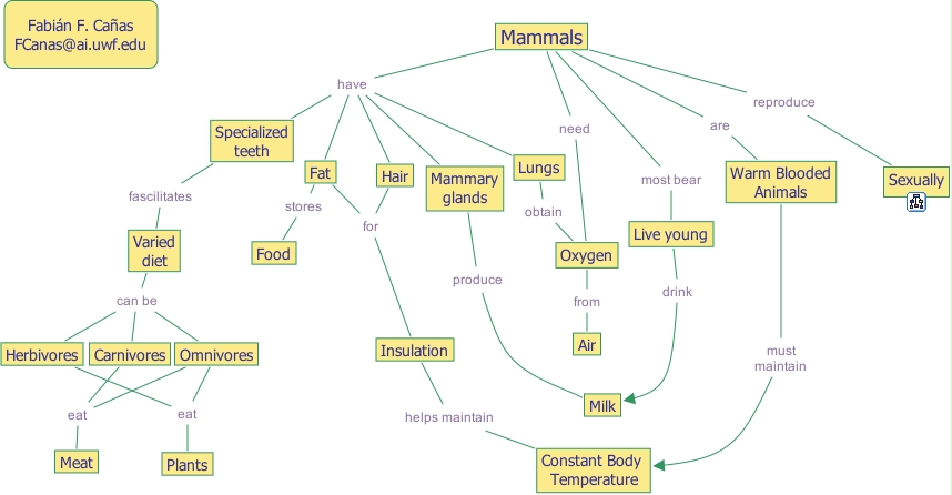 Specialized teeth fascilitates Varied diet, Mammals reproduce Sexually, Lungs obtain Oxygen, Mammals are Warm Blooded Animals, Oxygen from Air, Omnivores eat Plants, Mammals most bear Live young, Live young drink Milk, Mammals need Oxygen, Mammary glands produce Milk, Herbivores eat Plants, Warm Blooded Animals must maintain Constant Body Temperature, Fat stores Food, Mammals have Lungs, Mammals have Mammary glands, Mammals have Hair, Mammals have Specialized teeth, Mammals have Fat, Hair for Insulation, Carnivores eat Meat, Varied diet can be Herbivores, Varied diet can be Omnivores, Varied diet can be Carnivores, Omnivores eat Meat, Fat for Insulation, Insulation helps maintain Constant Body Temperature