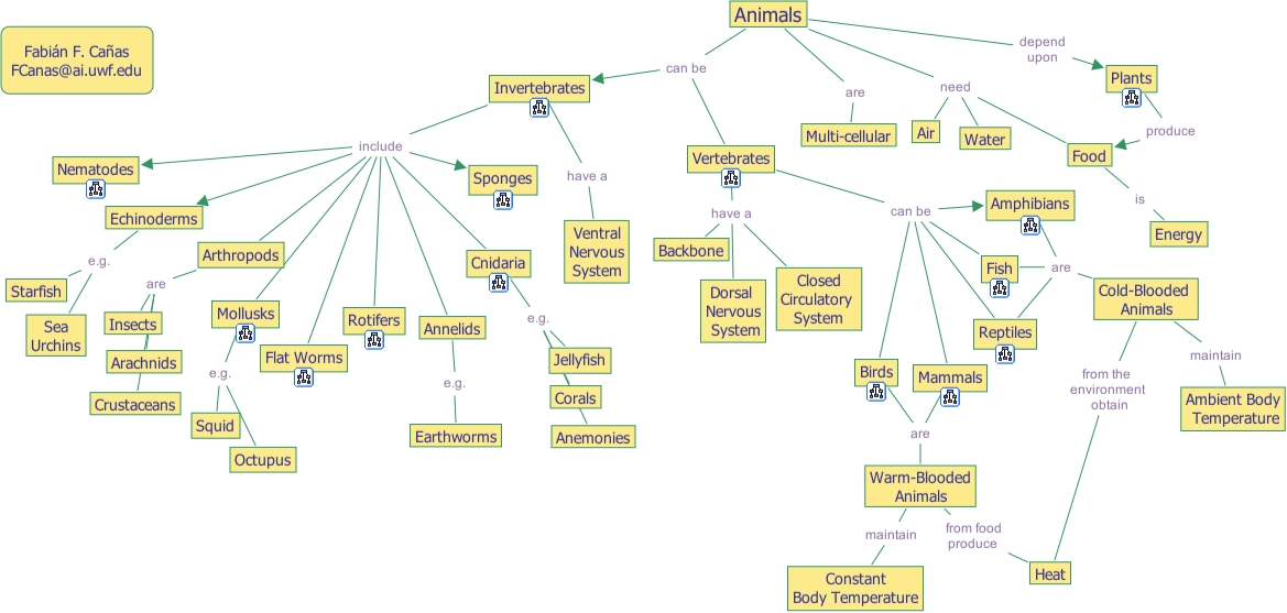 Amphibians are Cold-Blooded Animals, Arthropods are Arachnids, Arthropods are Insects, Arthropods are Crustaceans, Echinoderms e.g. Starfish, Echinoderms e.g. Sea Urchins, Vertebrates can be Mammals, Vertebrates can be Amphibians, Vertebrates can be Reptiles, Vertebrates can be Fish, Vertebrates can be Birds, Animals can be Vertebrates, Animals can be Invertebrates, Plants produce Food, Vertebrates have a Dorsal Nervous System, Vertebrates have a Closed Circulatory System, Vertebrates have a Backbone, Cold-Blooded Animals from the environment obtain Heat, Birds are Warm-Blooded Animals, Warm-Blooded Animals maintain Constant Body Temperature, Invertebrates have a Ventral Nervous System, Reptiles are Cold-Blooded Animals, Warm-Blooded Animals from food produce Heat, Annelids e.g. Earthworms, Mollusks e.g. Octupus, Mollusks e.g. Squid, Animals depend upon Plants, Mammals are Warm-Blooded Animals, Animals are Multi-cellular, Food is Energy, Animals need Food, Animals need Water, Animals need Air, Cnidaria e.g. Jellyfish, Cnidaria e.g. Corals, Cnidaria e.g. Anemonies, Cold-Blooded Animals maintain Ambient Body Temperature, Invertebrates include Echinoderms, Invertebrates include Nematodes, Invertebrates include Arthropods, Invertebrates include Cnidaria, Invertebrates include Mollusks, Invertebrates include Annelids, Invertebrates include Rotifers, Invertebrates include Sponges, Invertebrates include Flat Worms, Fish are Cold-Blooded Animals