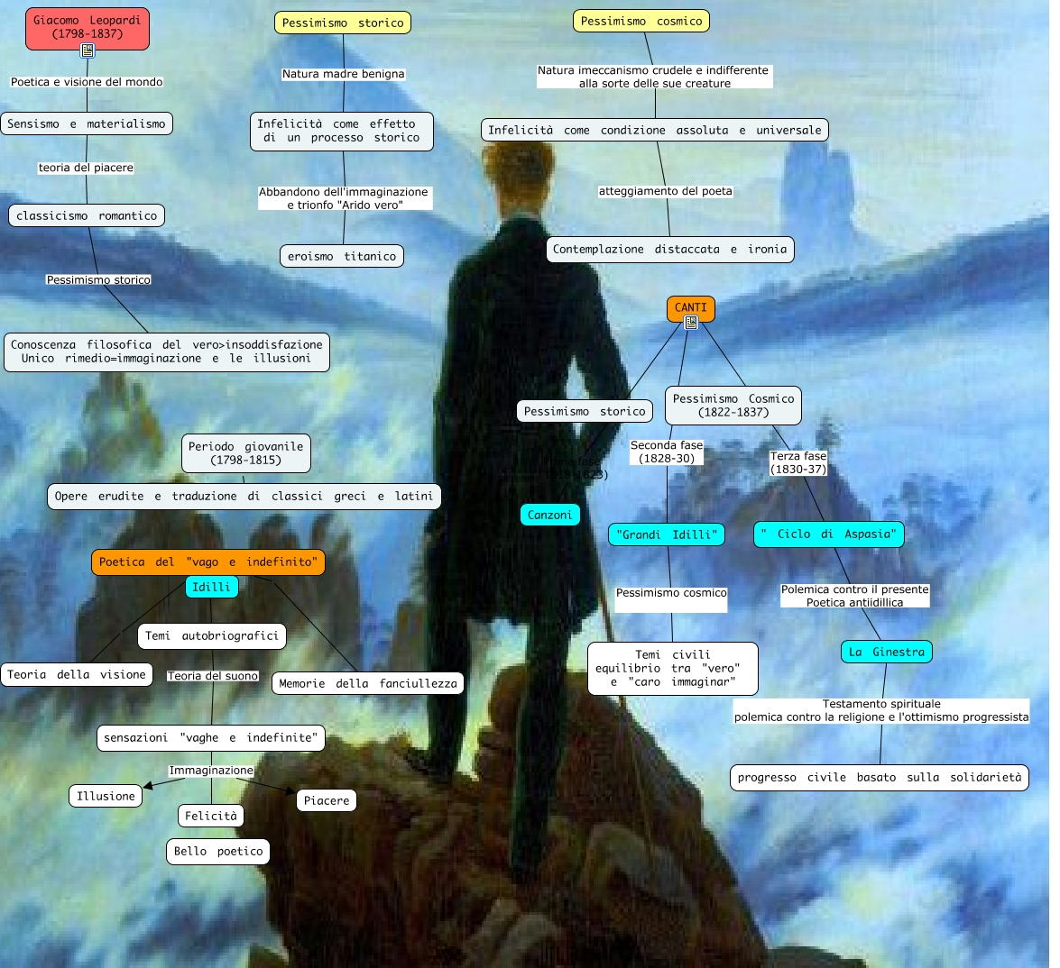 Questa Cmap, creata con IHMC CmapTools, contiene informazioni relative a: Leopardi, CANTI Prima fase (1818-1823) Canzoni, Pessimismo cosmico Natura imeccanismo crudele e indifferente alla sorte delle sue creature Infelicità come condizione assoluta e universale, CANTI Seconda fase (1828-30) "Grandi Idilli", classicismo romantico Pessimismo storico Conoscenza filosofica del vero>insoddisfazione Unico rimedio=immaginazione e le illusioni, Infelicità come effetto di un processo storico Abbandono dell'immaginazione e trionfo "Arido vero" eroismo titanico, " Ciclo di Aspasia" Polemica contro il presente Poetica antiidillica La Ginestra, "Grandi Idilli" Pessimismo cosmico Temi civili equilibrio tra "vero" e "caro immaginar", La Ginestra Testamento spirituale polemica contro la religione e l'ottimismo progressista progresso civile basato sulla solidarietà, Poetica del "vago e indefinito" Memorie della fanciullezza, sensazioni "vaghe e indefinite" Immaginazione Felicità, Poetica del "vago e indefinito" Teoria della visione, sensazioni "vaghe e indefinite" Immaginazione Illusione, CANTI Terza fase (1830-37) " Ciclo di Aspasia", Poetica del "vago e indefinito" Teoria del suono sensazioni "vaghe e indefinite", sensazioni "vaghe e indefinite" Immaginazione Piacere, Sensismo e materialismo teoria del piacere classicismo romantico, Periodo giovanile (1798-1815) Opere erudite e traduzione di classici greci e latini, Pessimismo storico Natura madre benigna Infelicità come effetto di un processo storico, Giacomo Leopardi (1798-1837) Poetica e visione del mondo Sensismo e materialismo, Infelicità come condizione assoluta e universale atteggiamento del poeta Contemplazione distaccata e ironia
