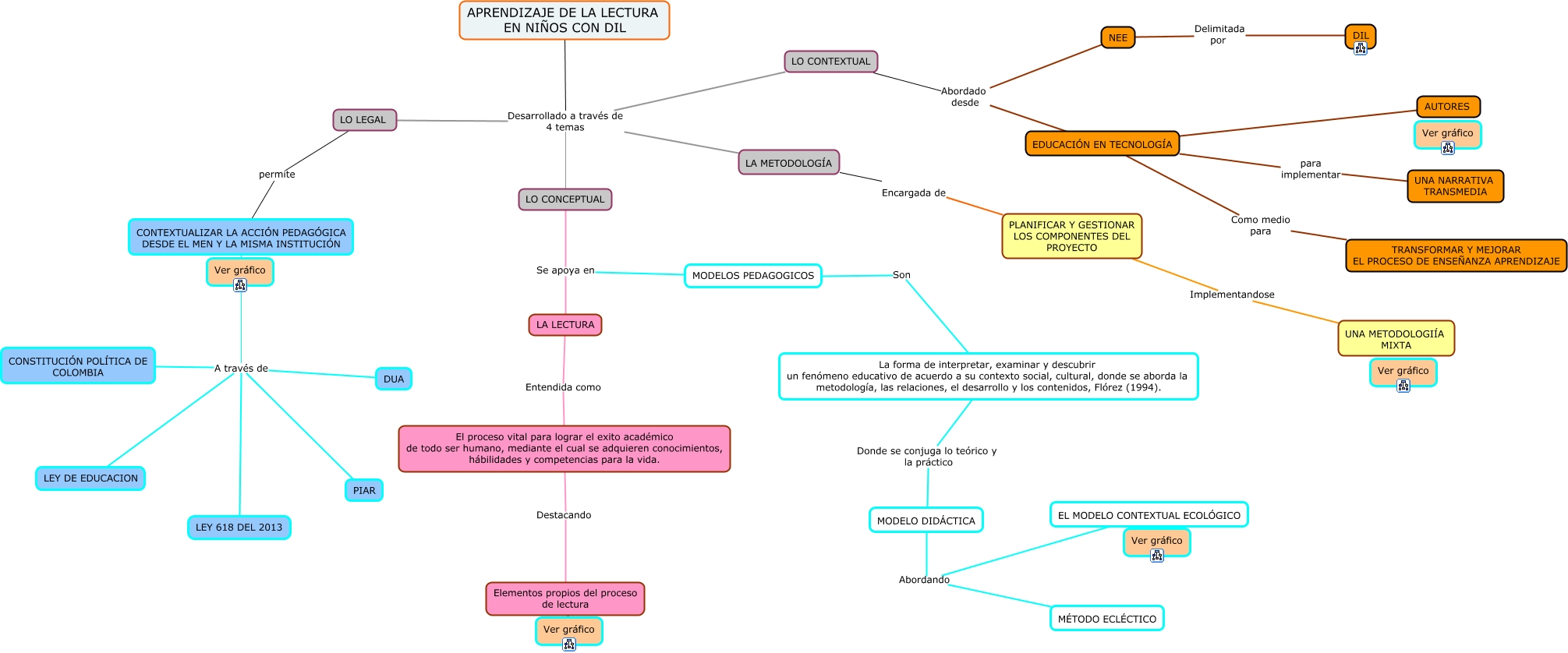 Este Cmap, tiene información relacionada con: Grafico proyecto 2, MODELOS PEDAGOGICOS Son La forma de interpretar, examinar y descubrir un fenómeno educativo de acuerdo a su contexto social, cultural, donde se aborda la metodología, las relaciones, el desarrollo y los contenidos, Flórez (1994)., MODELO DIDÁCTICA Abordando MÉTODO ECLÉCTICO, APRENDIZAJE DE LA LECTURA EN NIÑOS CON DIL Desarrollado a través de 4 temas LO CONTEXTUAL, LO CONCEPTUAL Se apoya en MODELOS PEDAGOGICOS, El proceso vital para lograr el exito académico de todo ser humano, mediante el cual se adquieren conocimientos, hábilidades y competencias para la vida. Destacando Elementos propios del proceso de lectura, APRENDIZAJE DE LA LECTURA EN NIÑOS CON DIL Desarrollado a través de 4 temas LO CONCEPTUAL, CONTEXTUALIZAR LA ACCIÓN PEDAGÓGICA DESDE EL MEN Y LA MISMA INSTITUCIÓN A través de LEY 618 DEL 2013, EDUCACIÓN EN TECNOLOGÍA para implementar UNA NARRATIVA TRANSMEDIA, CONTEXTUALIZAR LA ACCIÓN PEDAGÓGICA DESDE EL MEN Y LA MISMA INSTITUCIÓN A través de LEY DE EDUCACION, PLANIFICAR Y GESTIONAR LOS COMPONENTES DEL PROYECTO Implementandose UNA METODOLOGIÍA MIXTA, LA METODOLOGÍA Encargada de PLANIFICAR Y GESTIONAR LOS COMPONENTES DEL PROYECTO, NEE Delimitada por DIL, EDUCACIÓN EN TECNOLOGÍA AUTORES, LO CONTEXTUAL Abordado desde EDUCACIÓN EN TECNOLOGÍA, EDUCACIÓN EN TECNOLOGÍA Como medio para TRANSFORMAR Y MEJORAR EL PROCESO DE ENSEÑANZA APRENDIZAJE, LO LEGAL permite CONTEXTUALIZAR LA ACCIÓN PEDAGÓGICA DESDE EL MEN Y LA MISMA INSTITUCIÓN, LA LECTURA Entendida como El proceso vital para lograr el exito académico de todo ser humano, mediante el cual se adquieren conocimientos, hábilidades y competencias para la vida., LO CONCEPTUAL Se apoya en LA LECTURA, Elementos propios del proceso de lectura Ver gráfico, APRENDIZAJE DE LA LECTURA EN NIÑOS CON DIL Desarrollado a través de 4 temas LO LEGAL