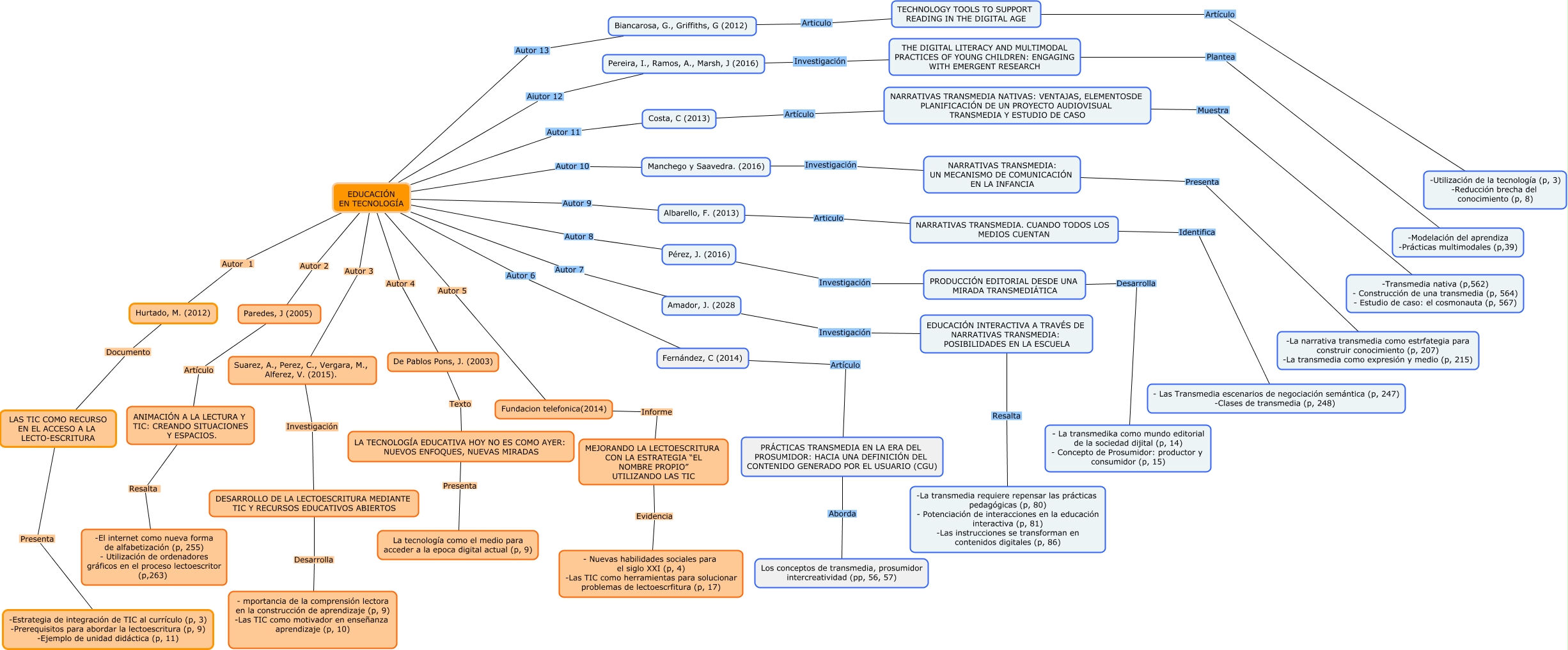 Este Cmap, tiene información relacionada con: Educación en tecnología 2, NARRATIVAS TRANSMEDIA NATIVAS: VENTAJAS, ELEMENTOSDE PLANIFICACIÓN DE UN PROYECTO AUDIOVISUAL TRANSMEDIA Y ESTUDIO DE CASO Muestra -Transmedia nativa (p,562) - Construcción de una transmedia (p, 564) - Estudio de caso: el cosmonauta (p, 567), EDUCACIÓN EN TECNOLOGÍA Autor 5 Fundacion telefonica(2014), EDUCACIÓN EN TECNOLOGÍA Aiutor 12 Pereira, I., Ramos, A., Marsh, J (2016), Pérez, J. (2016) Investigación PRODUCCIÓN EDITORIAL DESDE UNA MIRADA TRANSMEDIÁTICA, EDUCACIÓN EN TECNOLOGÍA Autor 10 Manchego y Saavedra. (2016), EDUCACIÓN EN TECNOLOGÍA Autor 3 Suarez, A., Perez, C., Vergara, M., Alferez, V. (2015)., ANIMACIÓN A LA LECTURA Y TIC: CREANDO SITUACIONES Y ESPACIOS. Resalta -El internet como nueva forma de alfabetización (p, 255) - Utilización de ordenadores gráficos en el proceso lectoescritor (p,263), THE DIGITAL LITERACY AND MULTIMODAL PRACTICES OF YOUNG CHILDREN: ENGAGING WITH EMERGENT RESEARCH Plantea -Modelación del aprendiza -Prácticas multimodales (p,39), Albarello, F. (2013) Articulo NARRATIVAS TRANSMEDIA. CUANDO TODOS LOS MEDIOS CUENTAN, PRODUCCIÓN EDITORIAL DESDE UNA MIRADA TRANSMEDIÁTICA Desarrolla - La transmedika como mundo editorial de la sociedad dijital (p, 14) - Concepto de Prosumidor: productor y consumidor (p, 15), EDUCACIÓN EN TECNOLOGÍA Autor 1 Hurtado, M. (2012), EDUCACIÓN EN TECNOLOGÍA Autor 13 Biancarosa, G., Griffiths, G (2012), DESARROLLO DE LA LECTOESCRITURA MEDIANTE TIC Y RECURSOS EDUCATIVOS ABIERTOS Desarrolla - mportancia de la comprensión lectora en la construcción de aprendizaje (p, 9) -Las TIC como motivador en enseñanza aprendizaje (p, 10), LA TECNOLOGÍA EDUCATIVA HOY NO ES COMO AYER: NUEVOS ENFOQUES, NUEVAS MIRADAS Presenta La tecnología como el medio para acceder a la epoca digital actual (p, 9), Fernández, C (2014) Artículo PRÁCTICAS TRANSMEDIA EN LA ERA DEL PROSUMIDOR: HACIA UNA DEFINICIÓN DEL CONTENIDO GENERADO POR EL USUARIO (CGU), EDUCACIÓN EN TECNOLOGÍA Autor 7 Amador, J. (2028, Hurtado, M. (2012) Documento LAS TIC COMO RECURSO EN EL ACCESO A LA LECTO-ESCRITURA, EDUCACIÓN EN TECNOLOGÍA Autor 9 Albarello, F. (2013), Paredes, J (2005) Artículo ANIMACIÓN A LA LECTURA Y TIC: CREANDO SITUACIONES Y ESPACIOS., Fundacion telefonica(2014) Informe MEJORANDO LA LECTOESCRITURA CON LA ESTRATEGIA “EL NOMBRE PROPIO” UTILIZANDO LAS TIC