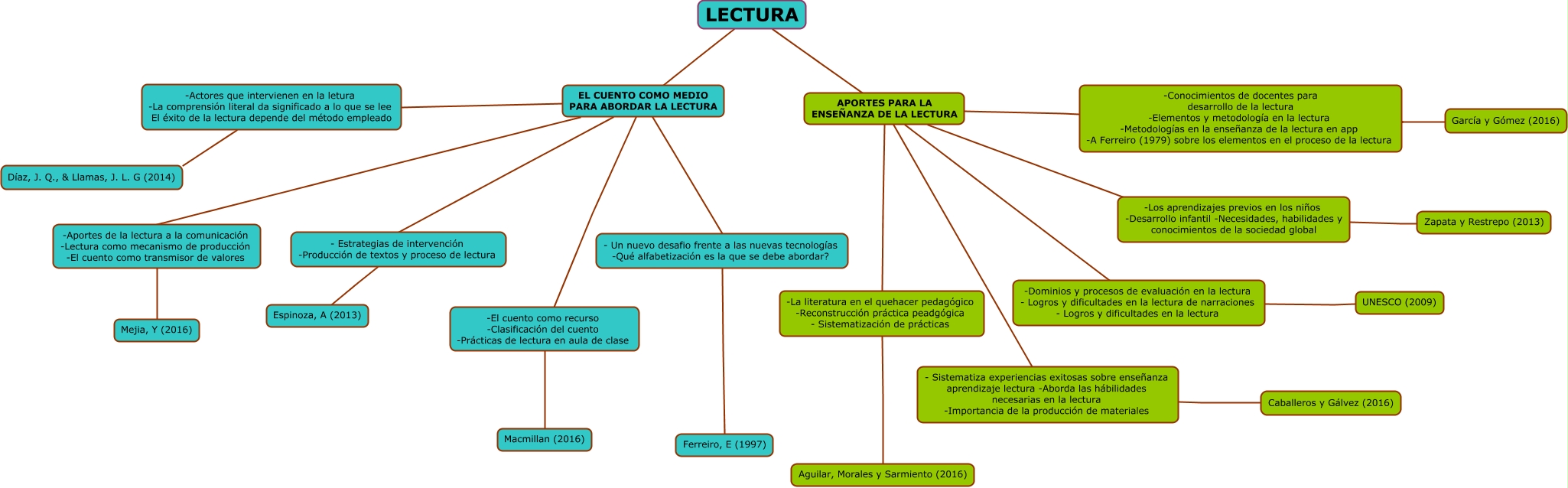 Este Cmap, tiene información relacionada con: Lectura, UNESCO (2009) -Dominios y procesos de evaluación en la lectura - Logros y dificultades en la lectura de narraciones - Logros y dificultades en la lectura, APORTES PARA LA ENSEÑANZA DE LA LECTURA -Dominios y procesos de evaluación en la lectura - Logros y dificultades en la lectura de narraciones - Logros y dificultades en la lectura, EL CUENTO COMO MEDIO PARA ABORDAR LA LECTURA - Estrategias de intervención -Producción de textos y proceso de lectura, Caballeros y Gálvez (2016) - Sistematiza experiencias exitosas sobre enseñanza aprendizaje lectura -Aborda las hábilidades necesarias en la lectura -Importancia de la producción de materiales, Aguilar, Morales y Sarmiento (2016) -La literatura en el quehacer pedagógico -Reconstrucción práctica peadgógica - Sistematización de prácticas, APORTES PARA LA ENSEÑANZA DE LA LECTURA -La literatura en el quehacer pedagógico -Reconstrucción práctica peadgógica - Sistematización de prácticas, García y Gómez (2016) -Conocimientos de docentes para desarrollo de la lectura -Elementos y metodología en la lectura -Metodologías en la enseñanza de la lectura en app -A Ferreiro (1979) sobre los elementos en el proceso de la lectura, EL CUENTO COMO MEDIO PARA ABORDAR LA LECTURA -Aportes de la lectura a la comunicación -Lectura como mecanismo de producción -El cuento como transmisor de valores, EL CUENTO COMO MEDIO PARA ABORDAR LA LECTURA -Actores que intervienen en la letura -La comprensión literal da significado a lo que se lee El éxito de la lectura depende del método empleado, EL CUENTO COMO MEDIO PARA ABORDAR LA LECTURA -El cuento como recurso -Clasificación del cuento -Prácticas de lectura en aula de clase, Zapata y Restrepo (2013) -Los aprendizajes previos en los niños -Desarrollo infantil -Necesidades, habilidades y conocimientos de la sociedad global, -Aportes de la lectura a la comunicación -Lectura como mecanismo de producción -El cuento como transmisor de valores Mejia, Y (2016), LECTURA EL CUENTO COMO MEDIO PARA ABORDAR LA LECTURA, -Actores que intervienen en la letura -La comprensión literal da significado a lo que se lee El éxito de la lectura depende del método empleado Díaz, J. Q., & Llamas, J. L. G (2014), EL CUENTO COMO MEDIO PARA ABORDAR LA LECTURA - Un nuevo desafio frente a las nuevas tecnologías -Qué alfabetización es la que se debe abordar?, APORTES PARA LA ENSEÑANZA DE LA LECTURA -Conocimientos de docentes para desarrollo de la lectura -Elementos y metodología en la lectura -Metodologías en la enseñanza de la lectura en app -A Ferreiro (1979) sobre los elementos en el proceso de la lectura, - Un nuevo desafio frente a las nuevas tecnologías -Qué alfabetización es la que se debe abordar? Ferreiro, E (1997), LECTURA APORTES PARA LA ENSEÑANZA DE LA LECTURA, - Estrategias de intervención -Producción de textos y proceso de lectura Espinoza, A (2013), APORTES PARA LA ENSEÑANZA DE LA LECTURA - Sistematiza experiencias exitosas sobre enseñanza aprendizaje lectura -Aborda las hábilidades necesarias en la lectura -Importancia de la producción de materiales