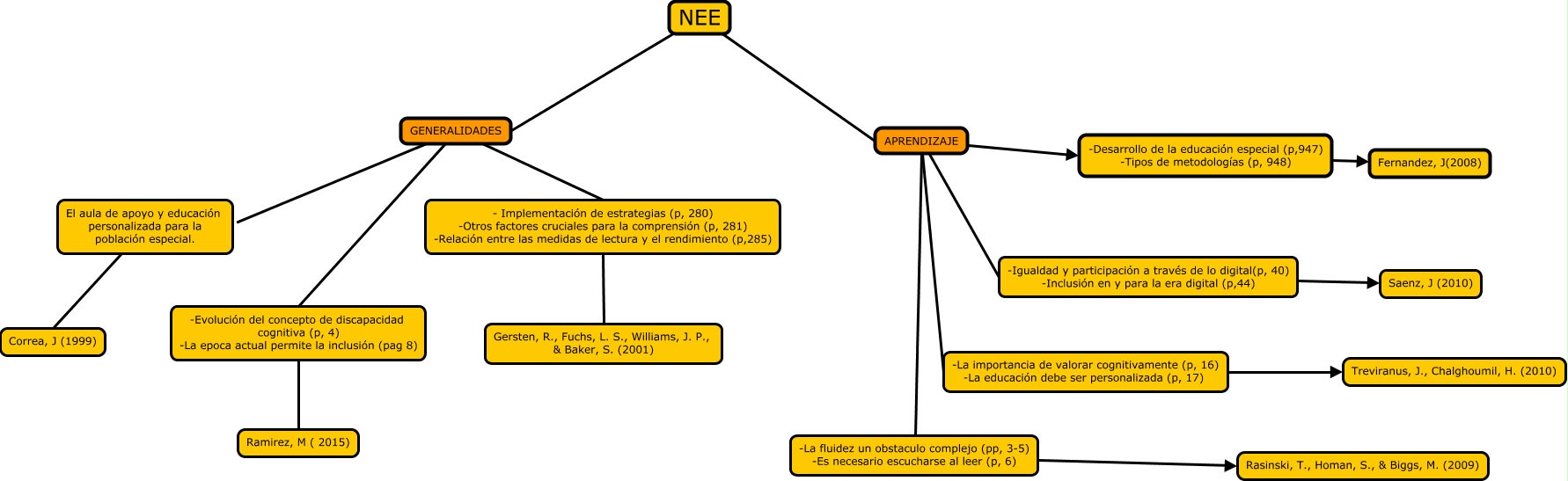 Este Cmap, tiene información relacionada con: NEE, GENERALIDADES -Evolución del concepto de discapacidad cognitiva (p, 4) -La epoca actual permite la inclusión (pag 8), -Igualdad y participación a través de lo digital(p, 40) -Inclusión en y para la era digital (p,44) Saenz, J (2010), -Desarrollo de la educación especial (p,947) -Tipos de metodologías (p, 948) Fernandez, J(2008), APRENDIZAJE -La fluidez un obstaculo complejo (pp, 3-5) -Es necesario escucharse al leer (p, 6), - Implementación de estrategias (p, 280) -Otros factores cruciales para la comprensión (p, 281) -Relación entre las medidas de lectura y el rendimiento (p,285) Gersten, R., Fuchs, L. S., Williams, J. P., & Baker, S. (2001), -La importancia de valorar cognitivamente (p, 16) -La educación debe ser personalizada (p, 17) Treviranus, J., Chalghoumil, H. (2010), -Evolución del concepto de discapacidad cognitiva (p, 4) -La epoca actual permite la inclusión (pag 8) Ramirez, M ( 2015), El aula de apoyo y educación personalizada para la población especial. Correa, J (1999), NEE APRENDIZAJE, GENERALIDADES - Implementación de estrategias (p, 280) -Otros factores cruciales para la comprensión (p, 281) -Relación entre las medidas de lectura y el rendimiento (p,285), APRENDIZAJE -La importancia de valorar cognitivamente (p, 16) -La educación debe ser personalizada (p, 17), APRENDIZAJE -Igualdad y participación a través de lo digital(p, 40) -Inclusión en y para la era digital (p,44), -La fluidez un obstaculo complejo (pp, 3-5) -Es necesario escucharse al leer (p, 6) Rasinski, T., Homan, S., & Biggs, M. (2009), APRENDIZAJE -Desarrollo de la educación especial (p,947) -Tipos de metodologías (p, 948), NEE GENERALIDADES