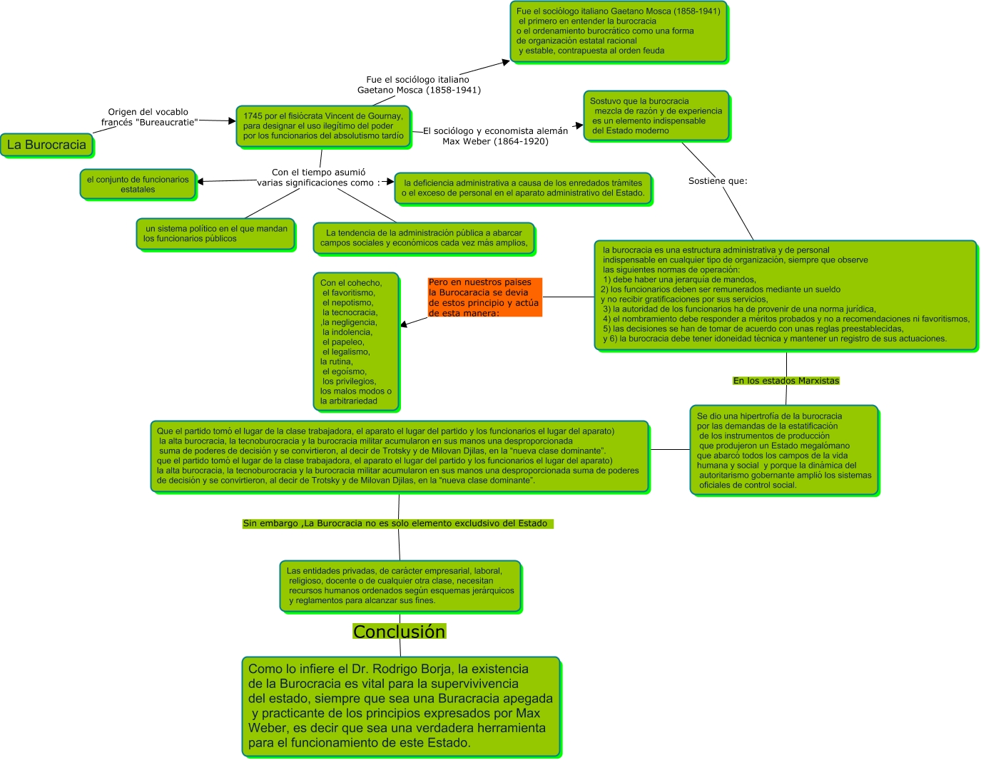 Este Cmap, tiene información relacionada con: Burocracia, 1745 por el fisiócrata Vincent de Gournay, para designar el uso ilegítimo del poder por los funcionarios del absolutismo tardío Con el tiempo asumió varias significaciones como : un sistema político en el que mandan los funcionarios públicos, la burocracia es una estructura administrativa y de personal indispensable en cualquier tipo de organización, siempre que observe las siguientes normas de operación: 1) debe haber una jerarquía de mandos, 2) los funcionarios deben ser remunerados mediante un sueldo y no recibir gratificaciones por sus servicios, 3) la autoridad de los funcionarios ha de provenir de una norma jurídica, 4) el nombramiento debe responder a méritos probados y no a recomendaciones ni favoritismos, 5) las decisiones se han de tomar de acuerdo con unas reglas preestablecidas, y 6) la burocracia debe tener idoneidad técnica y mantener un registro de sus actuaciones. Pero en nuestros paises la Burocaracia se devia de estos principio y actúa de esta manera: Con el cohecho, el favoritismo, el nepotismo, la tecnocracia, ,la negligencia, la indolencia, el papeleo, el legalismo, la rutina, el egoísmo, los privilegios, los malos modos o la arbitrariedad, Se dio una hipertrofía de la burocracia por las demandas de la estatificación de los instrumentos de producción que produjeron un Estado megalómano que abarcó todos los campos de la vida humana y social y porque la dinámica del autoritarismo gobernante amplió los sistemas oficiales de control social. La Dictadura del Proletariado ocasionó que: Que el partido tomó el lugar de la clase trabajadora, el aparato el lugar del partido y los funcionarios el lugar del aparato) la alta burocracia, la tecnoburocracia y la burocracia militar acumularon en sus manos una desproporcionada suma de poderes de decisión y se convirtieron, al decir de Trotsky y de Milovan Djilas, en la “nueva clase dominante”. que el partido tomó el lugar de la clase trabajadora, el aparato el lugar del partido y los funcionarios el lugar del aparato) la alta burocracia, la tecnoburocracia y la burocracia militar acumularon en sus manos una desproporcionada suma de poderes de decisión y se convirtieron, al decir de Trotsky y de Milovan Djilas, en la “nueva clase dominante”., La Burocracia Origen del vocablo francés "Bureaucratie" 1745 por el fisiócrata Vincent de Gournay, para designar el uso ilegítimo del poder por los funcionarios del absolutismo tardío, 1745 por el fisiócrata Vincent de Gournay, para designar el uso ilegítimo del poder por los funcionarios del absolutismo tardío El sociólogo y economista alemán Max Weber (1864-1920) Sostuvo que la burocracia mezcla de razón y de experiencia es un elemento indispensable del Estado moderno, 1745 por el fisiócrata Vincent de Gournay, para designar el uso ilegítimo del poder por los funcionarios del absolutismo tardío Con el tiempo asumió varias significaciones como : La tendencia de la administración pública a abarcar campos sociales y económicos cada vez más amplios,, 1745 por el fisiócrata Vincent de Gournay, para designar el uso ilegítimo del poder por los funcionarios del absolutismo tardío Con el tiempo asumió varias significaciones como : el conjunto de funcionarios estatales, la burocracia es una estructura administrativa y de personal indispensable en cualquier tipo de organización, siempre que observe las siguientes normas de operación: 1) debe haber una jerarquía de mandos, 2) los funcionarios deben ser remunerados mediante un sueldo y no recibir gratificaciones por sus servicios, 3) la autoridad de los funcionarios ha de provenir de una norma jurídica, 4) el nombramiento debe responder a méritos probados y no a recomendaciones ni favoritismos, 5) las decisiones se han de tomar de acuerdo con unas reglas preestablecidas, y 6) la burocracia debe tener idoneidad técnica y mantener un registro de sus actuaciones. En los estados Marxistas Se dio una hipertrofía de la burocracia por las demandas de la estatificación de los instrumentos de producción que produjeron un Estado megalómano que abarcó todos los campos de la vida humana y social y porque la dinámica del autoritarismo gobernante amplió los sistemas oficiales de control social., Las entidades privadas, de carácter empresarial, laboral, religioso, docente o de cualquier otra clase, necesitan recursos humanos ordenados según esquemas jerárquicos y reglamentos para alcanzar sus fines. Conclusión Como lo infiere el Dr. Rodrigo Borja, la existencia de la Burocracia es vital para la supervivivencia del estado, siempre que sea una Buracracia apegada y practicante de los principios expresados por Max Weber, es decir que sea una verdadera herramienta para el funcionamiento de este Estado., 1745 por el fisiócrata Vincent de Gournay, para designar el uso ilegítimo del poder por los funcionarios del absolutismo tardío Con el tiempo asumió varias significaciones como : la deficiencia administrativa a causa de los enredados trámites o el exceso de personal en el aparato administrativo del Estado., 1745 por el fisiócrata Vincent de Gournay, para designar el uso ilegítimo del poder por los funcionarios del absolutismo tardío Fue el sociólogo italiano Gaetano Mosca (1858-1941) Fue el sociólogo italiano Gaetano Mosca (1858-1941) el primero en entender la burocracia o el ordenamiento burocrático como una forma de organización estatal racional y estable, contrapuesta al orden feuda, Que el partido tomó el lugar de la clase trabajadora, el aparato el lugar del partido y los funcionarios el lugar del aparato) la alta burocracia, la tecnoburocracia y la burocracia militar acumularon en sus manos una desproporcionada suma de poderes de decisión y se convirtieron, al decir de Trotsky y de Milovan Djilas, en la “nueva clase dominante”. que el partido tomó el lugar de la clase trabajadora, el aparato el lugar del partido y los funci