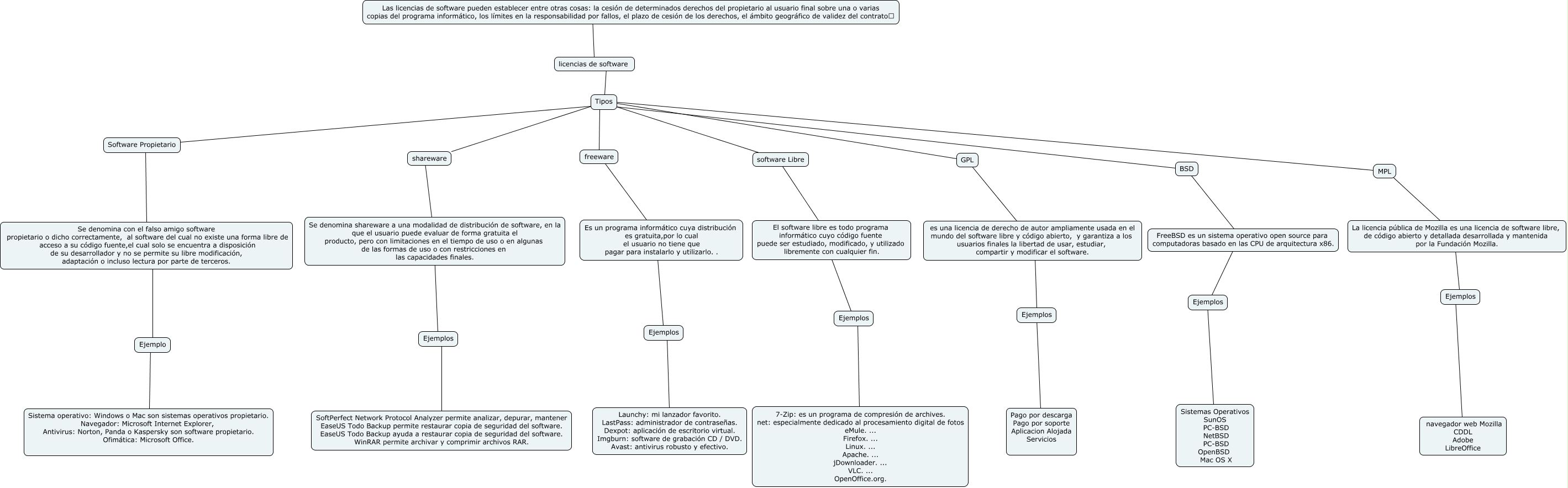 Este Cmap, tiene información relacionada con: ANDER, GPL ???? Tipos, software Libre ???? El software libre es todo programa informático cuyo código fuente puede ser estudiado, modificado, y utilizado libremente con cualquier fin., GPL ???? es una licencia de derecho de autor ampliamente usada en el mundo del software libre y código abierto, y garantiza a los usuarios finales la libertad de usar, estudiar, compartir y modificar el software., licencias de software ???? Tipos, software Libre ???? Tipos, MPL ???? La licencia pública de Mozilla es una licencia de software libre, de código abierto y detallada desarrollada y mantenida por la Fundación Mozilla., Se denomina shareware a una modalidad de distribución de software, en la que el usuario puede evaluar de forma gratuita el producto, pero con limitaciones en el tiempo de uso o en algunas de las formas de uso o con restricciones en las capacidades finales. ???? Ejemplos, El software libre es todo programa informático cuyo código fuente puede ser estudiado, modificado, y utilizado libremente con cualquier fin. ???? Ejemplos, Ejemplos ???? Sistemas Operativos SunOS PC-BSD NetBSD PC-BSD OpenBSD Mac OS X, Ejemplos ???? Pago por descarga Pago por soporte Aplicacion Alojada Servicios, shareware ???? Se denomina shareware a una modalidad de distribución de software, en la que el usuario puede evaluar de forma gratuita el producto, pero con limitaciones en el tiempo de uso o en algunas de las formas de uso o con restricciones en las capacidades finales., licencias de software ???? Las licencias de software pueden establecer entre otras cosas: la cesión de determinados derechos del propietario al usuario final sobre una o varias copias del programa informático, los límites en la responsabilidad por fallos, el plazo de cesión de los derechos, el ámbito geográfico de validez del contrato, Software Propietario ???? Tipos, Ejemplos ???? navegador web Mozilla CDDL Adobe LibreOffice, Es un programa informático cuya distribución es gratuita,por lo cual el usuario no tiene que pagar para instalarlo y utilizarlo. . ???? Ejemplos, Ejemplo ???? Sistema operativo: Windows o Mac son sistemas operativos propietario. Navegador: Microsoft Internet Explorer, Antivirus: Norton, Panda o Kaspersky son software propietario. Ofimática: Microsoft Office., shareware ???? Tipos, Ejemplos ???? Launchy: mi lanzador favorito. LastPass: administrador de contraseñas. Dexpot: aplicación de escritorio virtual. Imgburn: software de grabación CD / DVD. Avast: antivirus robusto y efectivo., BSD ???? FreeBSD es un sistema operativo open source para computadoras basado en las CPU de arquitectura x86., Ejemplos ???? 7-Zip: es un programa de compresión de archives. net: especialmente dedicado al procesamiento digital de fotos eMule. ... Firefox. ... Linux. ... Apache. ... jDownloader. ... VLC. ... OpenOffice.org.