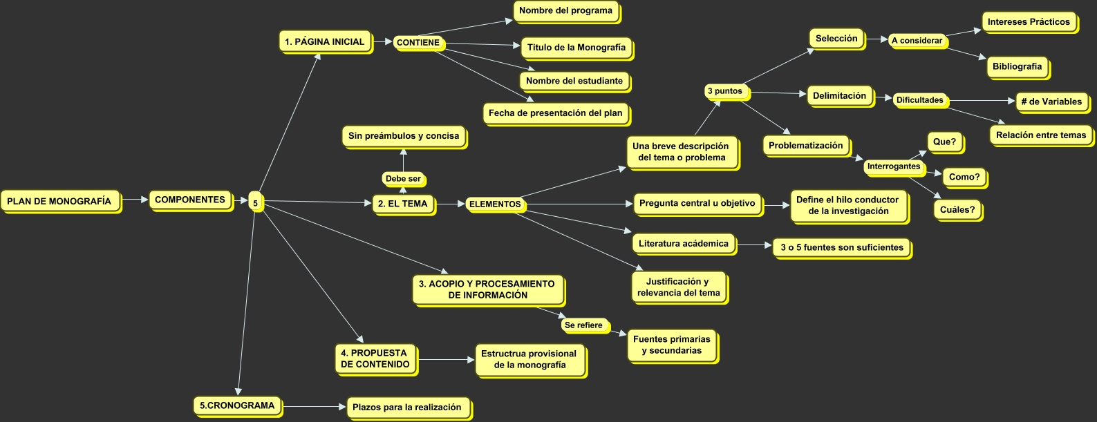 Este Cmap, tiene información relacionada con: PLAN DE MONOGRAFÍA, Delimitación Dificultades # de Variables, Pregunta central u objetivo ???? Define el hilo conductor de la investigación, Delimitación Dificultades Relación entre temas, Problematización Interrogantes Que?, COMPONENTES 5 5.CRONOGRAMA, 1. PÁGINA INICIAL CONTIENE Fecha de presentación del plan, 5.CRONOGRAMA ???? Plazos para la realización, 2. EL TEMA ELEMENTOS Justificación y relevancia del tema, Una breve descripción del tema o problema 3 puntos Selección, Selección A considerar Bibliografia, 2. EL TEMA ELEMENTOS Una breve descripción del tema o problema, Una breve descripción del tema o problema 3 puntos Problematización, COMPONENTES 5 3. ACOPIO Y PROCESAMIENTO DE INFORMACIÓN, 4. PROPUESTA DE CONTENIDO ???? Estructrua provisional de la monografía, Problematización Interrogantes Cuáles?, Literatura acádemica ???? 3 o 5 fuentes son suficientes, 2. EL TEMA ELEMENTOS Literatura acádemica, 1. PÁGINA INICIAL CONTIENE Nombre del programa, COMPONENTES 5 1. PÁGINA INICIAL, Problematización Interrogantes Como?