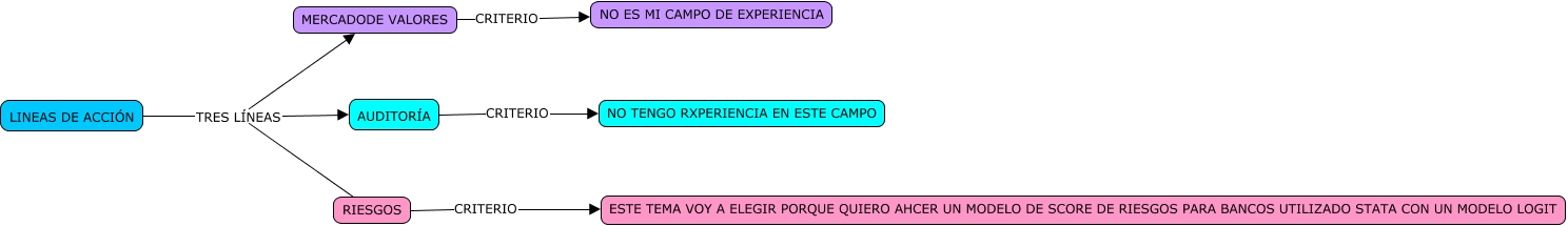 This Concept Map, created with IHMC CmapTools, has information related to: LINEAS DE INVESTIGACIÓN, LINEAS DE ACCIÓN TRES LÍNEAS RIESGOS, LINEAS DE ACCIÓN TRES LÍNEAS AUDITORÍA, MERCADODE VALORES CRITERIO NO ES MI CAMPO DE EXPERIENCIA, LINEAS DE ACCIÓN TRES LÍNEAS MERCADODE VALORES, AUDITORÍA CRITERIO NO TENGO RXPERIENCIA EN ESTE CAMPO, RIESGOS CRITERIO ESTE TEMA VOY A ELEGIR PORQUE QUIERO AHCER UN MODELO DE SCORE DE RIESGOS PARA BANCOS UTILIZADO STATA CON UN MODELO LOGIT