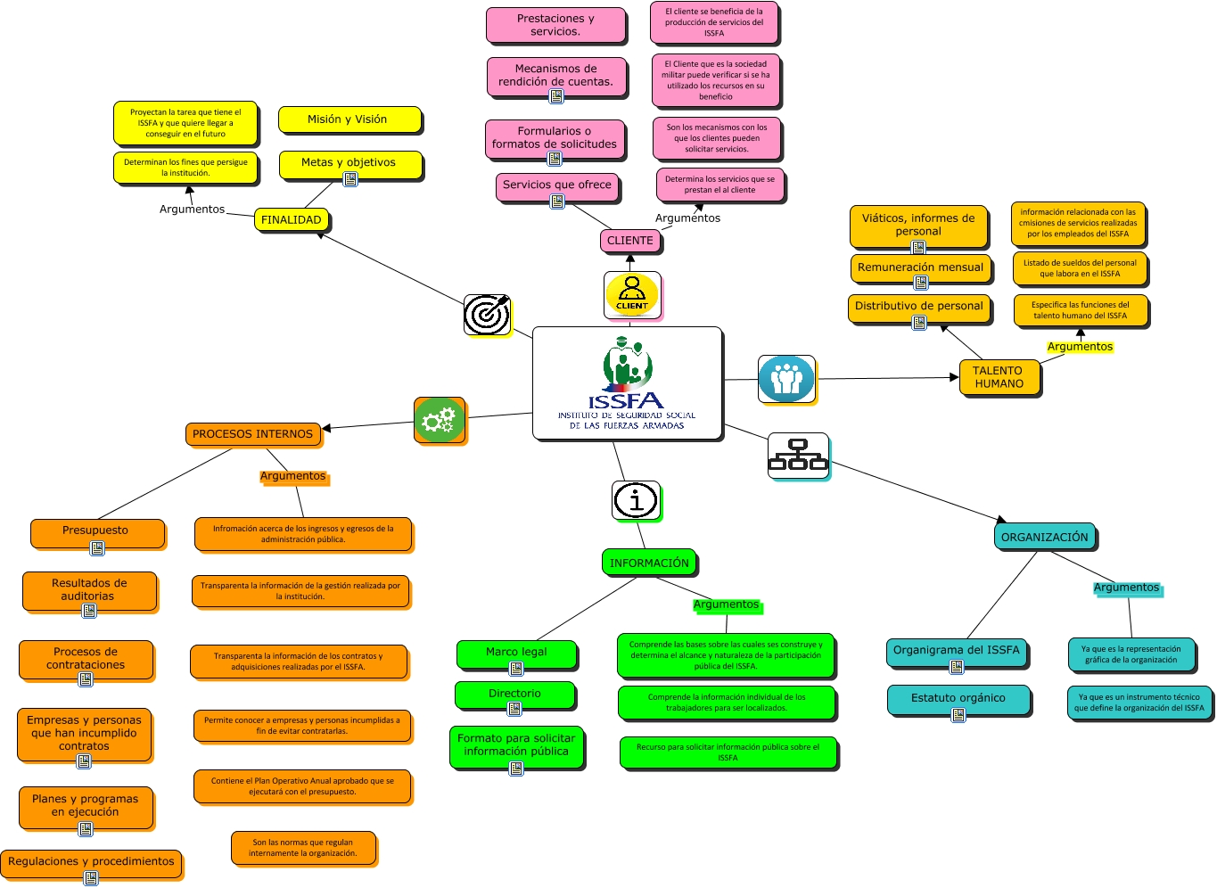 This Concept Map, created with IHMC CmapTools, has information related to: TRANSPARENCIA, TALENTO HUMANO ???? Distributivo de personal, CLIENTE ???? Servicios que ofrece, ???? FINALIDAD, ???? PROCESOS INTERNOS, INFORMACIÓN ???? Marco legal, ???? ORGANIZACIÓN, ???? INFORMACIÓN, FINALIDAD ???? Metas y objetivos, TALENTO HUMANO Argumentos Especifica las funciones del talento humano del ISSFA, FINALIDAD Argumentos Determinan los fines que persigue la institución., ORGANIZACIÓN Argumentos Ya que es la representación gráfica de la organización, ORGANIZACIÓN ???? Organigrama del ISSFA, ???? TALENTO HUMANO, CLIENTE Argumentos Determina los servicios que se prestan el al cliente, PROCESOS INTERNOS Argumentos Infromación acerca de los ingresos y egresos de la administración pública., PROCESOS INTERNOS ???? Presupuesto, INFORMACIÓN Argumentos Comprende las bases sobre las cuales ses construye y determina el alcance y naturaleza de la participación pública del ISSFA., Perspectiva CLIENTE