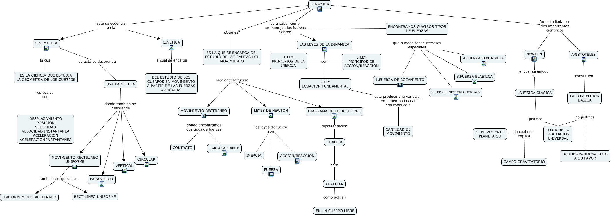 Este Cmap, tiene información relacionada con: MAPA DINAMICA, CINEMATICA la cual ES LA CIENCIA QUE ESTUDIA LA GEOMETRIA DE LOS CUERPOS, GRAFICA para ANALIZAR, DINAMICA fue estudiada por dos importantes cientificos ARISTOTELES, TORIA DE LA GRAITACION UNIVERSAL la cual nos explica EL MOVIMIENTO PLANETARIO, LEYES DE NEWTON las leyes de fuerza son ACCION/REACCION, UNA PARTICULA donde tambien se desprende PARABOLICO, TORIA DE LA GRAITACION UNIVERSAL la cual nos explica CAMPO GRAVITATORIO, MOVIMIENTO RECTILINEO donde encontramos dos tipos de fuerzas CONTACTO, LEYES DE NEWTON las leyes de fuerza son FUERZA, ES LA QUE SE ENCARGA DEL ESTUDIO DE LAS CAUSAS DEL MOVIMIENTO mediante la fuerza LEYES DE NEWTON, ES LA CIENCIA QUE ESTUDIA LA GEOMETRIA DE LOS CUERPOS los cuales son DESPLAZAMIENTO POSICION VELOCIDAD VELOCIDAD INSTANTANEA ACELERACION ACELERACION INSTANTANEA, LEYES DE NEWTON las leyes de fuerza son INERCIA, ES LA QUE SE ENCARGA DEL ESTUDIO DE LAS CAUSAS DEL MOVIMIENTO mediante la fuerza DIAGRAMA DE CUERPO LIBRE, LA FISICA CLASICA justifica TORIA DE LA GRAITACION UNIVERSAL, NEWTON el cual se enfoco en LA FISICA CLASICA, DINAMICA ¿Que es? ES LA QUE SE ENCARGA DEL ESTUDIO DE LAS CAUSAS DEL MOVIMIENTO, DINAMICA Esta se ecuentra en la CINEMATICA, DINAMICA para saber como se manejan las fuerzas existen ENCONTRAMOS CUATROS TIPOS DE FUERZAS, ENCONTRAMOS CUATROS TIPOS DE FUERZAS que pueden tener intereses especiales 4.FUERZA CENTRIPETA, UNA PARTICULA donde tambien se desprende MOVIMIENTO RECTILINEO UNIFORME