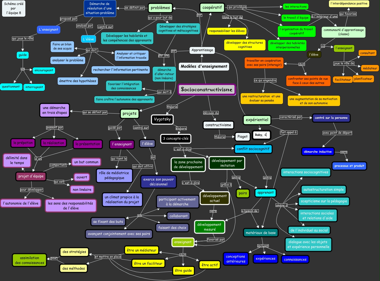 This Concept Map, created with IHMC CmapTools, has information related to: Cmap-0, L'élève qui doit Analyser et critiquer l'information trouvée, la présentation d'un projet d'équipe, projets centré sur l'élève, exerce son pouvoir décisionnel en avançant conjointement avec ses pairs, une démarche en trois étapes passant par la prépation, l'élève doit confronter ses points de vue face à ceux des autres, une démarche en trois étapes passant par la réalisation, L'élève qui doit analyser le problème, projet d'équipe qui est non linéaire, coopératif qui privilégie le travail d'équipe, apprenant amène à scepticisme sur la pédagogie, être un médiateur et mettre en place des méthodes, être un faciliteur et mettre en place des méthodes, la réalisation d'un projet d'équipe, Démarche de résolution d'une situation-problème proposé par L'enseignant, expérientiel fait appel à conflit sociocognitif, Développer les habiletés et les compétences des apprenants par une Développer des stratégies cognitives et métacognitives, être actif et mettre en place des stratégies, projet d'équipe pour développer l'autonomie de l'élève, développement par imitation entre pairs