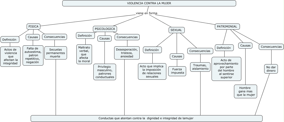 Este Cmap, tiene información relacionada con: violencia contra la mujer, VIOLENCIA CONTRA LA MUJER viene en forma SEXUAL, Definición ???? Maltrato verbal, que afecta la moral, PATRIMONIAL ???? Definición, PSICOLOGICA ???? Definición, Definición ???? Acto que implica la imposición de relaciones sexuales, Conductas que atentan contra la dignidad e integridad de lamujer ???? ????, Definición ???? Actos de violencia que afectan la integridad, SEXUAL ???? Definición, SEXUAL ???? Consecuencias, Consecuencias ???? Secuelas permanentes muerte, Causas ???? Fuerza impuesta, Conductas que atentan contra la dignidad e integridad de lamujer ???? Secuelas permanentes muerte, PSICOLOGICA ???? Consecuencias, VIOLENCIA CONTRA LA MUJER viene en forma PATRIMONIAL, Consecuencias ???? Traumas, aislamiento, VIOLENCIA CONTRA LA MUJER viene en forma FISICA, PATRIMONIAL ???? Consecuencias, Conductas que atentan contra la dignidad e integridad de lamujer ???? Traumas, aislamiento, PATRIMONIAL ???? Causas, Conductas que atentan contra la dignidad e integridad de lamujer ???? No dar dinero