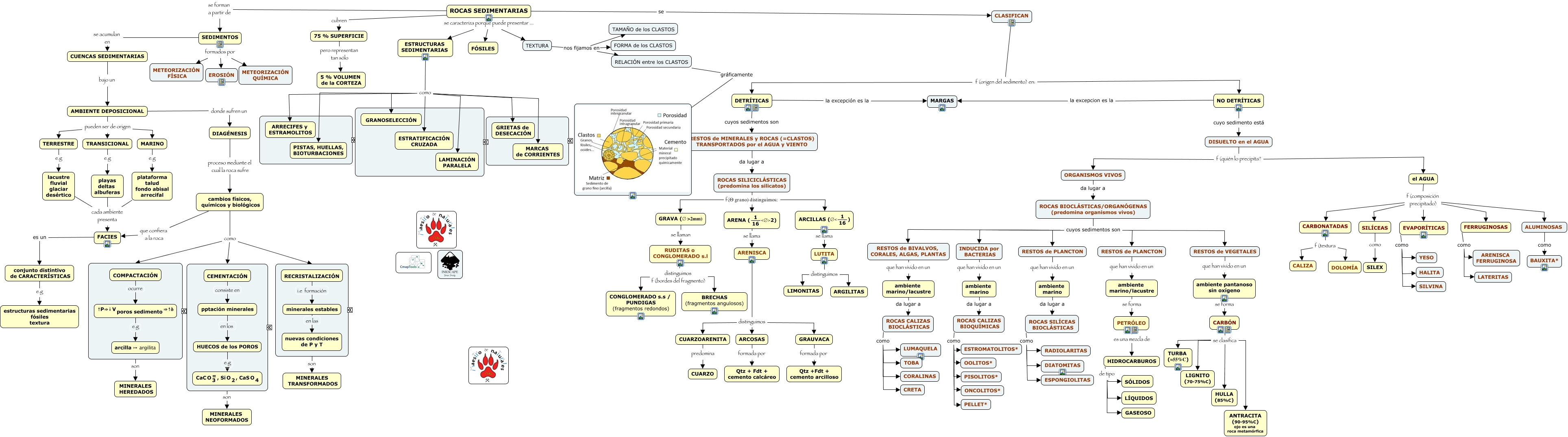 Este Cmap, tiene información relacionada con: Tema 7.3 Rocas sedimentarias, ARCOSAS formada por Qtz + Fdt + cemento calcáreo, ROCAS CALIZAS BIOCLÁSTICAS como LUMAQUELA, el AGUA f (composición precipitado) FERRUGINOSAS, ROCAS SILÍCEAS BIOCLÁSTICAS como RADIOLARITAS, ROCAS SILICICLÁSTICAS (predomina los silicatos) f(Θ grano) distinguimos: GRAVA (∅ ɮmm), ESTRUCTURAS SEDIMENTARIAS como ARRECIFES y ESTRAMOLITOS, <math xmlns="http://www.w3.org/1998/Math/MathML"> <mrow> <mtext> ↑P⇒↓ </mtext> <mmultiscripts> <mtext> V </mtext> <mtext> poros sedimento </mtext> <none/> </mmultiscripts> <mtext> ⇒↑δ </mtext> </mrow> </math> e.g arcilla ↦ argilita, ROCAS SILICICLÁSTICAS (predomina los silicatos) f(Θ grano) distinguimos: <math xmlns="http://www.w3.org/1998/Math/MathML"> <mrow> <mtext> ARENA ( </mtext> <mfrac> <mtext> 1 </mtext> <mtext> 16 </mtext> </mfrac> <mtext> ≺∅≻2) </mtext> </mrow> </math>, ambiente marino/lacustre se forma PETRÓLEO, ESTRUCTURAS SEDIMENTARIAS como LAMINACIÓN PARALELA, conjunto distintivo de CARACTERÍSTICAS e.g estructuras sedimentarias fósiles textura, ARENISCA distinguimos CUARZOARENITA, RELACIÓN entre los CLASTOS gráficamente, el AGUA f (composición precipitado) EVAPORÍTICAS, ROCAS CALIZAS BIOQUÍMICAS como PISOLITOS*, minerales sedimentarios son MINERALES TRANSFORMADOS, ESTRUCTURAS SEDIMENTARIAS como ESTRATIFICACIÓN CRUZADA, ambiente marino da lugar a ROCAS SILÍCEAS BIOCLÁSTICAS, ESTRUCTURAS SEDIMENTARIAS como MARCAS de CORRIENTES, cambios físicos, químicos y biológicos que confiera a la roca FACIES