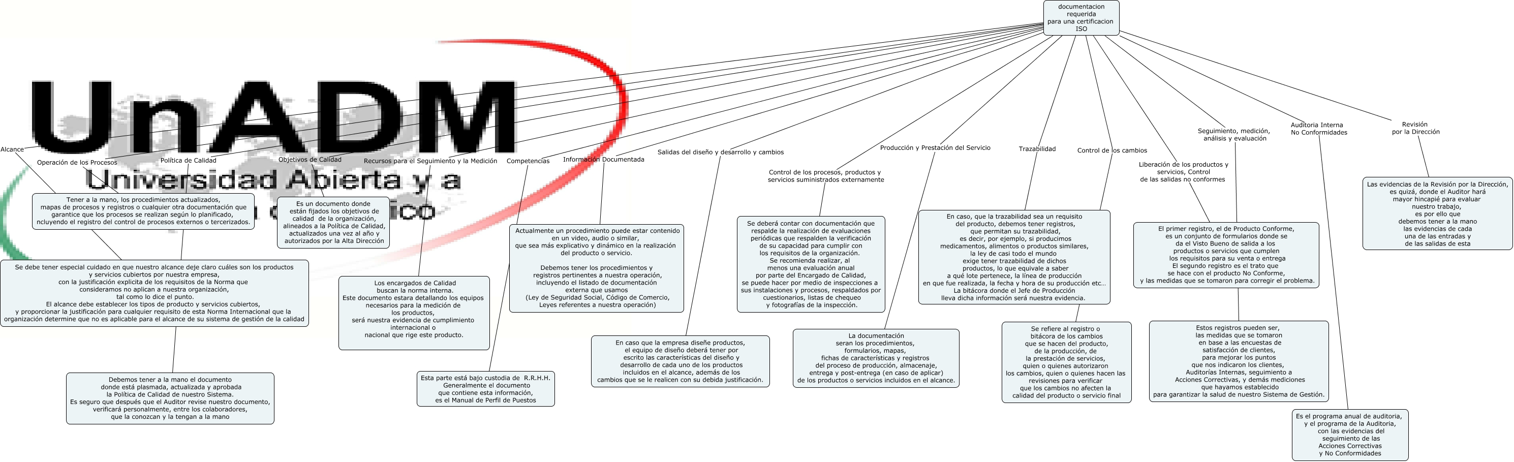 Este Cmap, tiene información relacionada con: Calidad, documentacion requerida para una certificacion ISO Política de Calidad Debemos tener a la mano el documento donde está plasmada, actualizada y aprobada la Política de Calidad de nuestro Sistema. Es seguro que después que el Auditor revise nuestro documento, verificará personalmente, entre los colaboradores, que la conozcan y la tengan a la mano, documentacion requerida para una certificacion ISO Recursos para el Seguimiento y la Medición Los encargados de Calidad buscan la norma interna. Este documento estara detallando los equipos necesarios para la medición de los productos, será nuestra evidencia de cumplimiento internacional o nacional que rige este producto., documentacion requerida para una certificacion ISO Operación de los Procesos Tener a la mano, los procedimientos actualizados, mapas de procesos y registros o cualquier otra documentación que garantice que los procesos se realizan según lo planificado, ncluyendo el registro del control de procesos externos o tercerizados., documentacion requerida para una certificacion ISO Control de los procesos, productos y servicios suministrados externamente Se deberá contar con documentación que respalde la realización de evaluaciones periódicas que respalden la verificación de su capacidad para cumplir con los requisitos de la organización. Se recomienda realizar, al menos una evaluación anual por parte del Encargado de Calidad, se puede hacer por medio de inspecciones a sus instalaciones y procesos, respaldados por cuestionarios, listas de chequeo y fotografías de la inspección., documentacion requerida para una certificacion ISO Competencias Esta parte está bajo custodia de R.R.H.H. Generalmente el documento que contiene esta información, es el Manual de Perfil de Puestos, documentacion requerida para una certificacion ISO Liberación de los productos y servicios, Control de las salidas no conformes El primer registro, el de Producto Conforme, es un conjunto de formularios donde se da el Visto Bueno de salida a los productos o servicios que cumplen los requisitos para su venta o entrega El segundo registro es el trato que se hace con el producto No Conforme, y las medidas que se tomaron para corregir el problema., documentacion requerida para una certificacion ISO Trazabilidad En caso, que la trazabilidad sea un requisito del producto, debemos tener registros, que permitan su trazabilidad, es decir, por ejemplo, si producimos medicamentos, alimentos o productos similares, la ley de casi todo el mundo exige tener trazabilidad de dichos productos, lo que equivale a saber a qué lote pertenece, la línea de producción en que fue realizada, la fecha y hora de su producción etc… La bitácora donde el Jefe de Producción lleva dicha información será nuestra evidencia., documentacion requerida para una certificacion ISO Producción y Prestación del Servicio La documentación seran los procedimientos, formularios, mapas, fichas de características y registros del proceso de producción, almacenaje, entrega y post-entrega (en caso de aplicar) de los productos o servicios incluidos en el alcance., documentacion requerida para una certificacion ISO Revisión por la Dirección Las evidencias de la Revisión por la Dirección, es quizá, donde el Auditor hará mayor hincapié para evaluar nuestro trabajo, es por ello que debemos tener a la mano las evidencias de cada una de las entradas y de las salidas de esta, documentacion requerida para una certificacion ISO Objetivos de Calidad Es un documento donde están fijados los objetivos de calidad de la organización, alineados a la Política de Calidad, actualizados una vez al año y autorizados por la Alta Dirección, documentacion requerida para una certificacion ISO Salidas del diseño y desarrollo y cambios En caso que la empresa diseñe productos, el equipo de diseño deberá tener por escrito las características del diseño y desarrollo de cada uno de los productos incluidos en el alcance, además de los cambios que se le realicen con su debida justificación., documentacion requerida para una certificacion ISO Control de los cambios Se refiere al registro o bitácora de los cambios que se hacen del producto, de la producción, de la prestación de servicios, quien o quienes autorizaron los cambios, quien o quienes hacen las revisiones para verificar que los cambios no afecten la calidad del producto o servicio final, documentacion requerida para una certificacion ISO Auditoria Interna No Conformidades Es el programa anual de auditoria, y el programa de la Auditoria, con las evidencias del seguimiento de las Acciones Correctivas y No Conformidades, documentacion requerida para una certificacion ISO Seguimiento, medición, análisis y evaluación Estos registros pueden ser, las medidas que se tomaron en base a las encuestas de satisfacción de clientes, para mejorar los puntos que nos indicaron los clientes, Auditorías Internas, seguimiento a Acciones Correctivas, y demás mediciones que hayamos establecido para garantizar la salud de nuestro Sistema de Gestión., documentacion requerida para una certificacion ISO Información Documentada Actualmente un procedimiento puede estar contenido en un video, audio o similar, que sea más explicativo y dinámico en la realización del producto o servicio. Debemos tener los procedimientos y registros pertinentes a nuestra operación, incluyendo el listado de documentación externa que usamos (Ley de Seguridad Social, Código de Comercio, Leyes referentes a nuestra operación), documentacion requerida para una certificacion ISO Alcance Se debe tener especial cuidado en que nuestro alcance deje claro cuáles son los productos y servicios cubiertos por nuestra empresa, con la justificación explicita de los requisitos de la Norma que consideramos no aplican a nuestra organización, tal como lo dice el punto. El alcance debe establecer los tipos de producto y servicios cubie