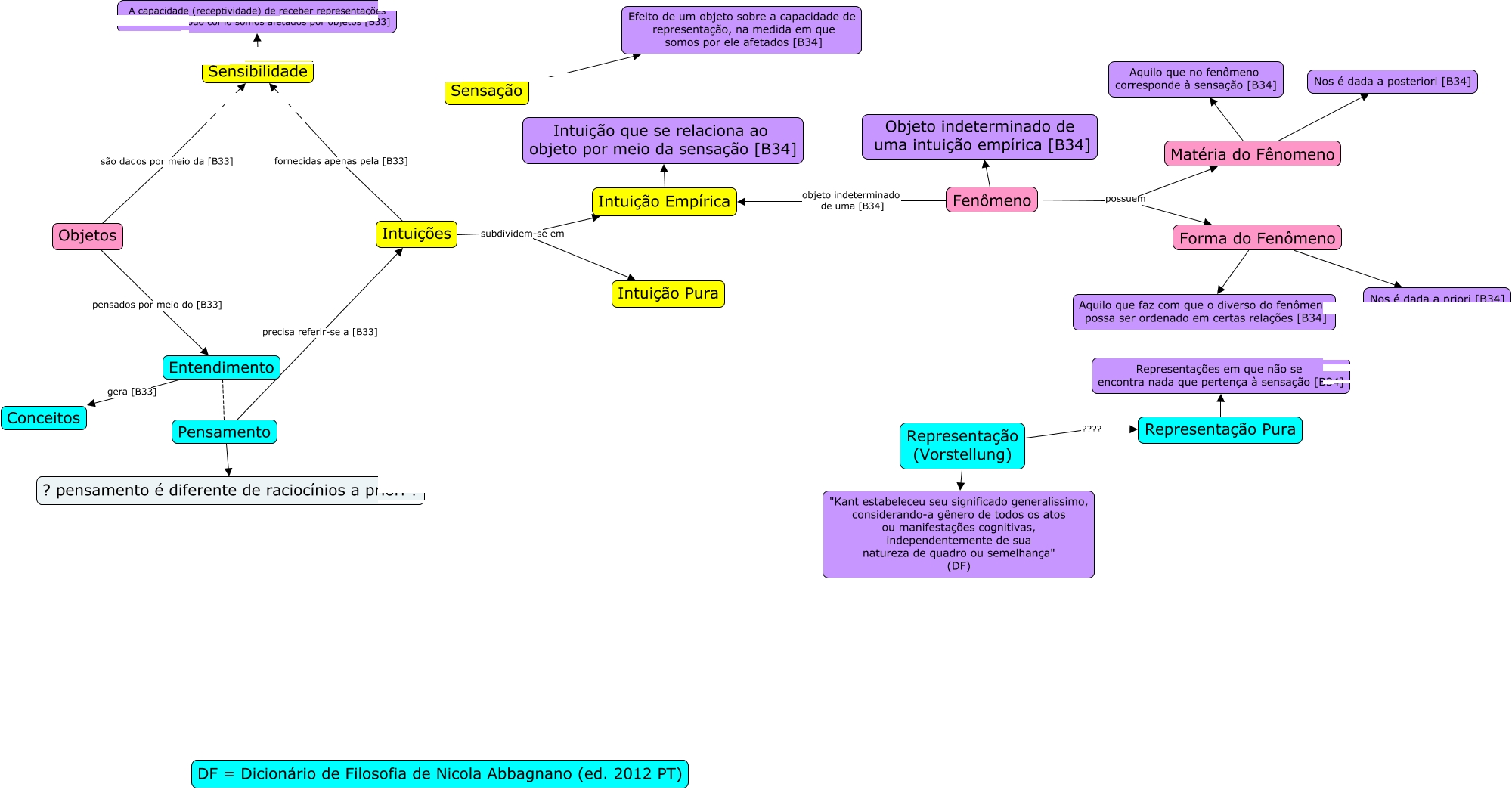 Esse mapa conceitual, produzido no IHMC CmapTools, tem a informação relacionada a: CRÍTICA DA RAZÃO PURA - SEGUNDO O LIVRO DE KANT, Representação (Vorstellung) ???? Representação Pura, Representação Pura Representações em que não se encontra nada que pertença à sensação [B34], Pensamento precisa referir-se a [B33] Intuições, Matéria do Fênomeno Aquilo que no fenômeno corresponde à sensação [B34], Matéria do Fênomeno Nos é dada a posteriori [B34], Objetos são dados por meio da [B33] Sensibilidade, Objetos pensados por meio do [B33] Entendimento, Intuições subdividem-se em Intuição Empírica, Entendimento gera [B33] Conceitos, Fenômeno possuem Matéria do Fênomeno, Fenômeno Objeto indeterminado de uma intuição empírica [B34], Sensação Efeito de um objeto sobre a capacidade de representação, na medida em que somos por ele afetados [B34], Forma do Fenômeno Aquilo que faz com que o diverso do fenômeno possa ser ordenado em certas relações [B34], Intuições fornecidas apenas pela [B33] Sensibilidade, Fenômeno objeto indeterminado de uma [B34] Intuição Empírica, Sensibilidade A capacidade (receptividade) de receber representações através do modo como somos afetados por objetos [B33], Pensamento Entendimento, Forma do Fenômeno Nos é dada a priori [B34], Pensamento ? pensamento é diferente de raciocínios a priori ?, Intuições subdividem-se em Intuição Pura