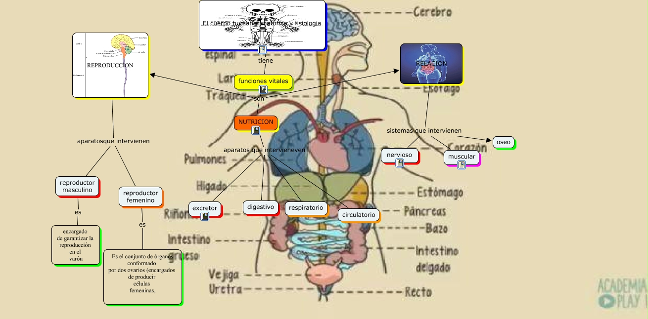 Este Cmap, tiene información relacionada con: MAPA ACTIVIDAD 10, NUTRICION aparatos que intervieneven excretor, funciones vitales son NUTRICION, RELACION sistemas que intervienen nervioso, funciones vitales son RELACION, reproductor femenino es Es el conjunto de órganos conformado por dos ovarios (encargados de producir células femeninas,, NUTRICION aparatos que intervieneven circulatorio, REPRODUCCION aparatosque intervienen reproductor femenino, El cuerpo humano:anatomia y fisiologia tiene funciones vitales, RELACION sistemas que intervienen muscular, NUTRICION aparatos que intervieneven respiratorio, reproductor masculino es encargado de garantizar la reproducción en el varón, funciones vitales son REPRODUCCION, NUTRICION aparatos que intervieneven digestivo, REPRODUCCION aparatosque intervienen reproductor masculino, RELACION sistemas que intervienen oseo