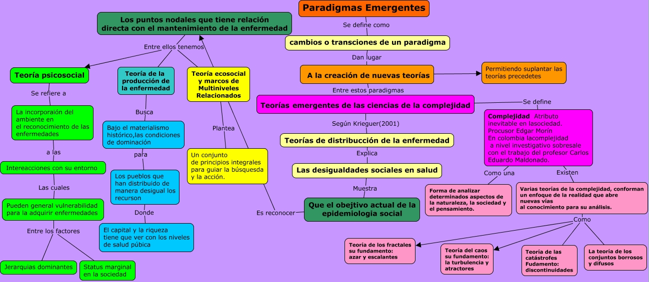 Este Cmap, tiene información relacionada con: Paradigmas emergentes mapa 1, La incorporaión del ambiente en el reconocimiento de las enfermedades a las Intereacciones con su entorno, Teoría ecosocial y marcos de Multiniveles Relacionados Plantea Un conjunto de principios integrales para guiar la búsquesda y la acción., A la creación de nuevas teorías ???? Permitiendo suplantar las teorías precedetes, Los puntos nodales que tiene relación directa con el mantenimiento de la enfermedad Entre ellos tenemos Teoría ecosocial y marcos de Multiniveles Relacionados, Paradigmas Emergentes Se define como cambios o transciones de un paradigma, Bajo el materialismo histórico,las condiciones de dominación para Los pueblos que han distribuido de manera desigual los recurson, Pueden general vulnerabilidad para la adquirir enfermedades Entre los factores Jerarquias dominantes, Varias teorías de la complejidad, conforman un enfoque de la realidad que abre nuevas vías al conocimiento para su análisis. Como La teoría de los conjuntos borrosos y difusos, Varias teorías de la complejidad, conforman un enfoque de la realidad que abre nuevas vías al conocimiento para su análisis. Como Teoría de los fractales su fundamento: azar y escalantes, Los pueblos que han distribuido de manera desigual los recurson Donde El capital y la riqueza tiene que ver con los niveles de salud púbica, Intereacciones con su entorno Las cuales Pueden general vulnerabilidad para la adquirir enfermedades, Pueden general vulnerabilidad para la adquirir enfermedades Entre los factores Status marginal en la sociedad, cambios o transciones de un paradigma Dan lugar A la creación de nuevas teorías, Las desigualdades sociales en salud Muestra Que el obejtivo actual de la epidemiologia social, A la creación de nuevas teorías Entre estos paradigmas Teorías emergentes de las ciencias de la complejidad, Complejidad Atributo inevitable en lasociedad. Procusor Edgar Morín En colombia lacomplejidad a nivel investigativo sobresale con el trabajo del profesor Carlos Eduardo Maldonado. Como una Forma de analizar determinados aspectos de la naturaleza, la sociedad y el pensamiento., Que el obejtivo actual de la epidemiologia social Es reconocer Los puntos nodales que tiene relación directa con el mantenimiento de la enfermedad, Los puntos nodales que tiene relación directa con el mantenimiento de la enfermedad Entre ellos tenemos Teoría de la producción de la enfermedad, Los puntos nodales que tiene relación directa con el mantenimiento de la enfermedad Entre ellos tenemos Teoría psicosocial, Varias teorías de la complejidad, conforman un enfoque de la realidad que abre nuevas vías al conocimiento para su análisis. Como Teoría de las catástrofes Fudamento: discontinuidades