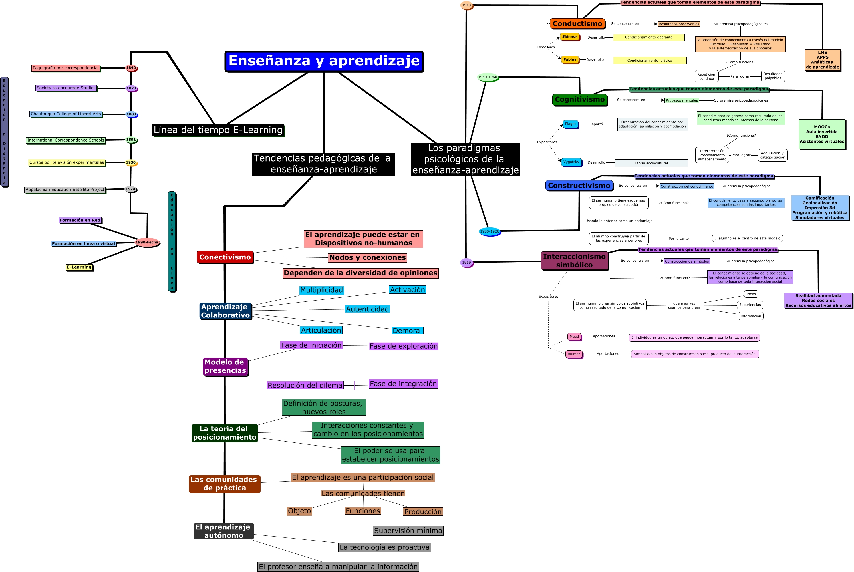 Este Cmap, tiene información relacionada con: Enseñanza aprendizaje, Piaget Aportó Organización del conocimiednto por adaptación, asimilación y acomodación, Conductismo Se concentra en Resultados observables, Conductismo Tendencias actuales que toman elementos de este paradigma LMS APPS Análíticas de aprendizaje, Enseñanza y aprendizaje ???? Los paradigmas psicológicos de la enseñanza-aprendizaje, El alumno construyea partir de las experiencias anteriores Por lo tanto El alumno es el centro de este modelo, Cognitivismo Tendencias actuales que toman elementos de este paradigma MOOCs Aula invertida BYOD Asistentes virtuales, Interaccionismo simbólico Tendencias actuales qeu toman elementos de este paradigma Realidad aumentada Redes sociales Recursos educativos abiertos, Línea del tiempo E-Learning 1930 Cursos por televisión experimentales, Conductismo Expositores Skinner, Constructivismo Se concentra en Construcción del conocimiento, Tendencias pedagógicas de la enseñanza-aprendizaje El aprendizaje autónomo Supervisión mínima, Tendencias pedagógicas de la enseñanza-aprendizaje Aprendizaje Colaborativo Activación, Skinner Desarrolló Condicionamiento operante, Cognitivismo Expositores Piaget, Interaccionismo simbólico Se concentra en Construcción de símbolos, El ser humano crea símbolos subjetivos como resultado de la comunicación que a su vez usamos para crear Información, Repetición continua Para lograr Resultados palpables, Constructivismo Expositores Piaget, Fase de iniciación Fase de exploración Fase de integración, El conocimiento se obtiene de la sociedad, las relaciones interpersonales y la comunicación como base de toda interacción social ¿Cómo funciona? El ser humano crea símbolos subjetivos como resultado de la comunicación