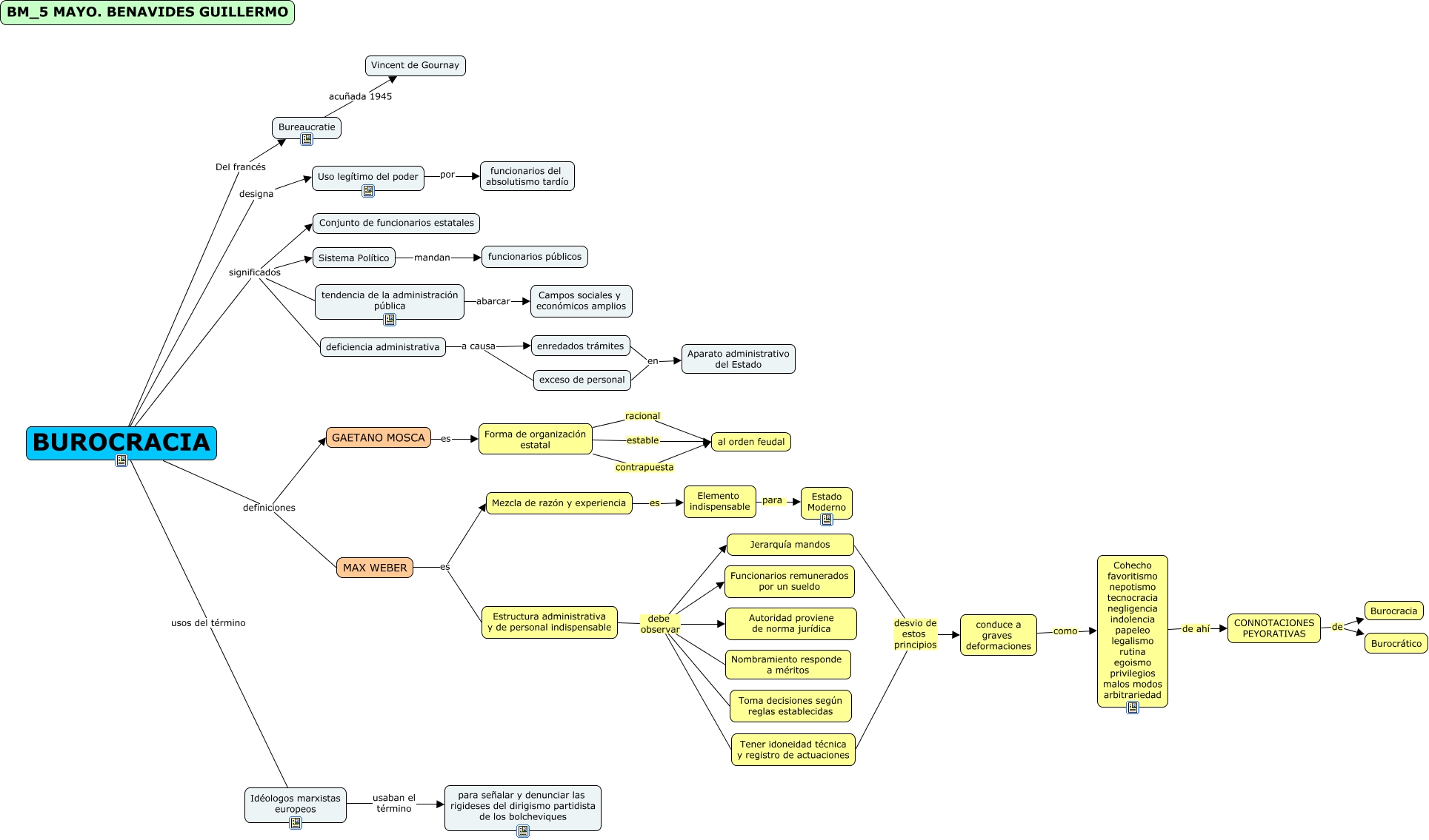 Este Cmap, tiene información relacionada con: 3. Burocracia, BUROCRACIA Del francés Bureaucratie, Forma de organización estatal contrapuesta al orden feudal, exceso de personal en Aparato administrativo del Estado, Estructura administrativa y de personal indispensable debe observar Nombramiento responde a méritos, BUROCRACIA significados tendencia de la administración pública, BUROCRACIA significados Sistema Político, Forma de organización estatal racional al orden feudal, Estructura administrativa y de personal indispensable debe observar Tener idoneidad técnica y registro de actuaciones, BUROCRACIA usos del término Idéologos marxistas europeos, CONNOTACIONES PEYORATIVAS de Burocracia, Idéologos marxistas europeos usaban el término para señalar y denunciar las rigideses del dirigismo partidista de los bolcheviques, Cohecho favoritismo nepotismo tecnocracia negligencia indolencia papeleo legalismo rutina egoismo privilegios malos modos arbitrariedad de ahí CONNOTACIONES PEYORATIVAS, deficiencia administrativa a causa enredados trámites, Uso legítimo del poder por funcionarios del absolutismo tardío, Estructura administrativa y de personal indispensable debe observar Jerarquía mandos, Elemento indispensable para Estado Moderno, Tener idoneidad técnica y registro de actuaciones desvio de estos principios conduce a graves deformaciones, Mezcla de razón y experiencia es Elemento indispensable, MAX WEBER es Estructura administrativa y de personal indispensable, BUROCRACIA designa Uso legítimo del poder