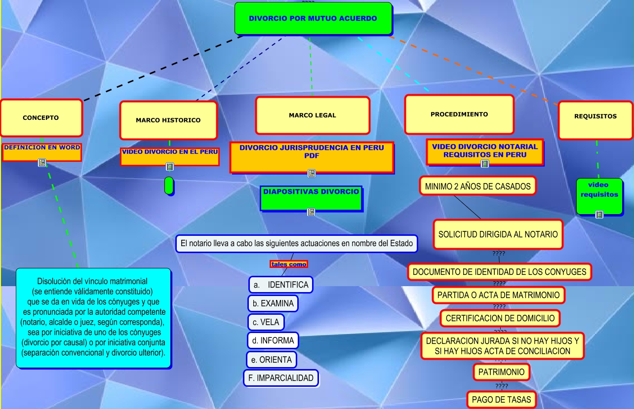 Este Cmap, tiene información relacionada con: DIVORCIO MUTUO ACUERDO, CONCEPTO DEFINICION EN WORD Disolución del vínculo matrimonial (se entiende válidamente constituido) que se da en vida de los cónyuges y que es pronunciada por la autoridad competente (notario, alcalde o juez, según corresponda), sea por iniciativa de uno de los cónyuges (divorcio por causal) o por iniciativa conjunta (separación convencional y divorcio ulterior)., DOCUMENTO DE IDENTIDAD DE LOS CONYUGES ???? PARTIDA O ACTA DE MATRIMONIO, PARTIDA O ACTA DE MATRIMONIO ???? CERTIFICACION DE DOMICILIO, CERTIFICACION DE DOMICILIO ???? DECLARACION JURADA SI NO HAY HIJOS Y SI HAY HIJOS ACTA DE CONCILIACION, SOLICITUD DIRIGIDA AL NOTARIO ???? DOCUMENTO DE IDENTIDAD DE LOS CONYUGES, DIVORCIO POR MUTUO ACUERDO ???? PROCEDIMIENTO, REQUISITOS video requisitos, DECLARACION JURADA SI NO HAY HIJOS Y SI HAY HIJOS ACTA DE CONCILIACION ???? PATRIMONIO, DIVORCIO POR MUTUO ACUERDO ???? CONCEPTO, MARCO HISTORICO ???? PROCEDIMIENTO, MINIMO 2 AÑOS DE CASADOS ???? SOLICITUD DIRIGIDA AL NOTARIO, MARCO HISTORICO ???? CONCEPTO, DIVORCIO POR MUTUO ACUERDO ???? REQUISITOS, PATRIMONIO ???? PAGO DE TASAS, MARCO HISTORICO VIDEO DIVORCIO EN EL PERU, DIVORCIO POR MUTUO ACUERDO ???? MARCO LEGAL, El notario lleva a cabo las siguientes actuaciones en nombre del Estado tales como a. IDENTIFICA