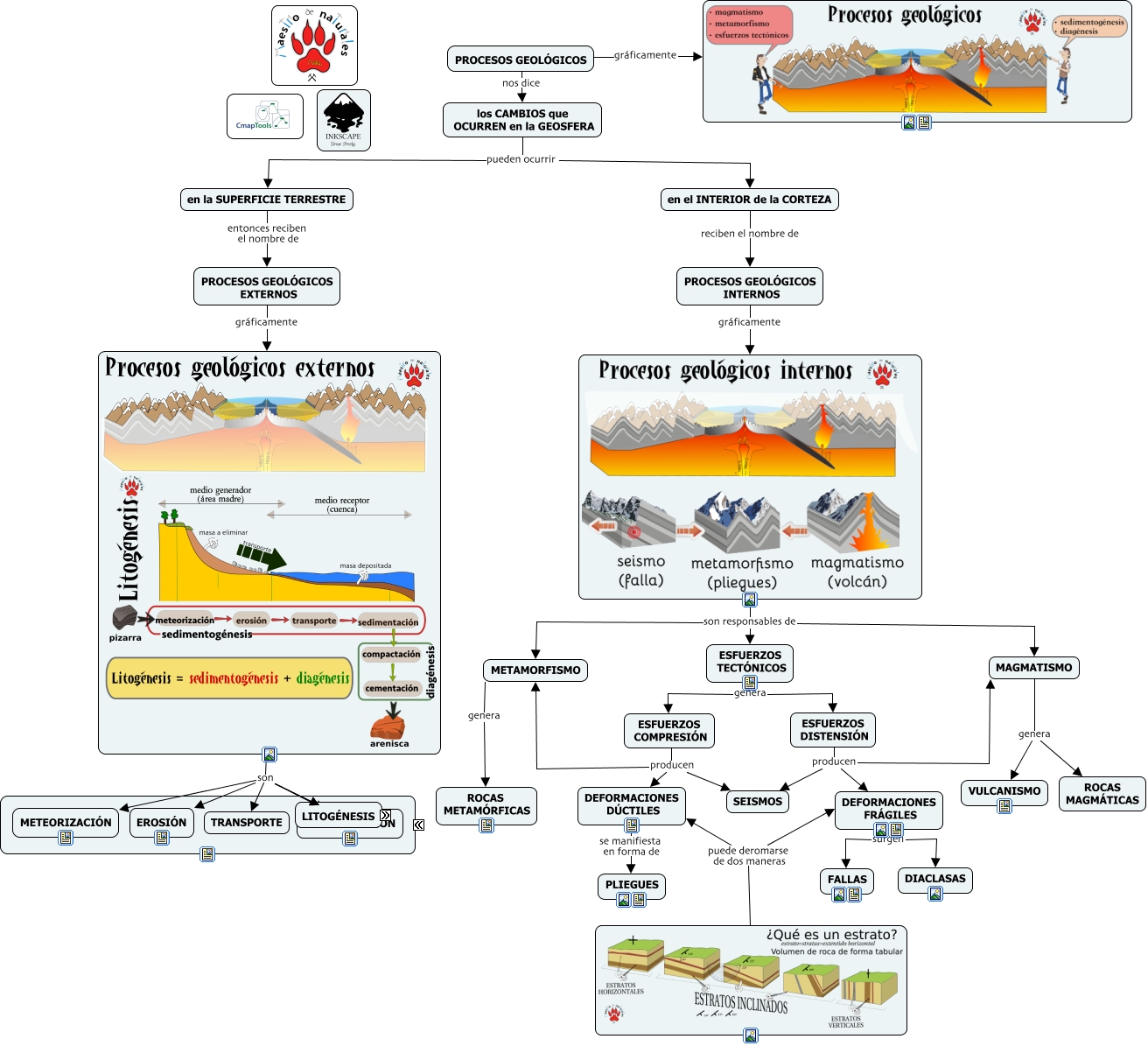 Este Cmap, tiene información relacionada con: 3.2 Procesos geológicos internos, ESFUERZOS DISTENSIÓN producen SEISMOS, son responsables de ESFUERZOS TECTÓNICOS, DEFORMACIONES FRÁGILES surgen FALLAS, son SEDIMENTACIÓN, PROCESOS GEOLÓGICOS nos dice los CAMBIOS que OCURREN en la GEOSFERA, son COMPACTACIÓN, ESFUERZOS COMPRESIÓN producen METAMORFISMO, puede deromarse de dos maneras DEFORMACIONES FRÁGILES, son responsables de MAGMATISMO, MAGMATISMO genera VULCANISMO, en el INTERIOR de la CORTEZA reciben el nombre de PROCESOS GEOLÓGICOS INTERNOS, MAGMATISMO genera ROCAS MAGMÁTICAS, en la SUPERFICIE TERRESTRE entonces reciben el nombre de PROCESOS GEOLÓGICOS EXTERNOS, PROCESOS GEOLÓGICOS EXTERNOS gráficamente, ESFUERZOS COMPRESIÓN producen SEISMOS, PROCESOS GEOLÓGICOS INTERNOS gráficamente, son responsables de METAMORFISMO, son EROSIÓN, ESFUERZOS TECTÓNICOS genera ESFUERZOS DISTENSIÓN, DEFORMACIONES FRÁGILES surgen DIACLASAS
