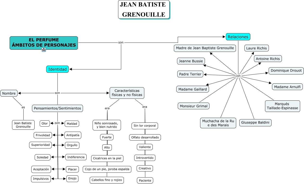 Este Cmap, tiene información relacionada con: EL PERFUME ÁMBITO DE PERSONAJES, Relaciones con Giuseppe Baldini, Pensamientos/Sentimientos son Frivolidad, Pensamientos/Sentimientos son Olor, Características físicas y no físicas era Cabellos fino y rojizo, Características físicas y no físicas era Sin lor corporal, Relaciones con Madame Arnulfi, Nombre es Jean Batiste Grenouille, Pensamientos/Sentimientos son Antipatía, Identidad son Características físicas y no físicas, Características físicas y no físicas era Paciente, EL PERFUME ÁMBITOS DE PERSONAJES son Identidad, Relaciones con Laure Richis, EL PERFUME ÁMBITOS DE PERSONAJES son Relaciones, Relaciones con Marqués Taillade-Espinasse, Pensamientos/Sentimientos son Superioridad, Características físicas y no físicas era Olfato desarrollado, Pensamientos/Sentimientos son Enojo, Relaciones con Muchacha de la Ru e des Marais, Características físicas y no físicas era Cicatrices en la piel, Relaciones con Jeanne Bussie