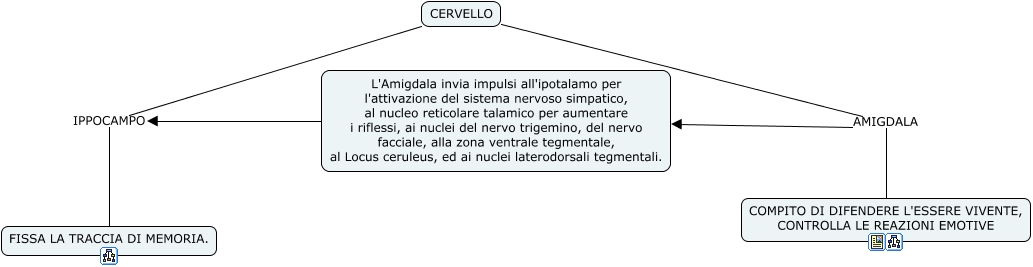 Questa Cmap, creata con IHMC CmapTools, contiene informazioni relative a: SISTEMA NERVOSO CENTRALE, CERVELLO IPPOCAMPO FISSA LA TRACCIA DI MEMORIA., L'Amigdala invia impulsi all'ipotalamo per l'attivazione del sistema nervoso simpatico, al nucleo reticolare talamico per aumentare i riflessi, ai nuclei del nervo trigemino, del nervo facciale, alla zona ventrale tegmentale, al Locus ceruleus, ed ai nuclei laterodorsali tegmentali. IPPOCAMPO FISSA LA TRACCIA DI MEMORIA., CERVELLO AMIGDALA L'Amigdala invia impulsi all'ipotalamo per l'attivazione del sistema nervoso simpatico, al nucleo reticolare talamico per aumentare i riflessi, ai nuclei del nervo trigemino, del nervo facciale, alla zona ventrale tegmentale, al Locus ceruleus, ed ai nuclei laterodorsali tegmentali., CERVELLO AMIGDALA COMPITO DI DIFENDERE L'ESSERE VIVENTE, CONTROLLA LE REAZIONI EMOTIVE
