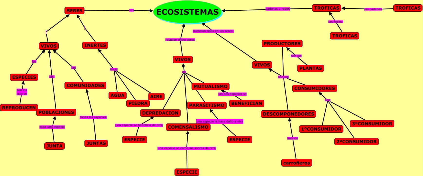 Este Cmap, tiene información relacionada con: ECOSISTEMAS, ESPECIE una especie se come las sobras de otra COMENSALISMO, MUTUALISMO es VIVOS, 2ºCONSUMIDOR son CONSUMIDORES, JUNTAS todas las especies COMUNIDADES, VIVOS nutricion tipos en los seres ECOSISTEMAS, POBLACIONES las VIVOS, PARASITISMO es VIVOS, carroñeros son los DESCOMPONEDORES, ESPECIE una especie se beneficia de otra DEPREDACION, VIVOS SERES, JUNTA toda una especie POBLACIONES, 3ºCONSUMIDOR son CONSUMIDORES, DESCOMPONEDORES son los VIVOS, TROFICAS cadenas y redes ECOSISTEMAS, PIEDRA es el INERTES, TROFICAS las cadenas TROFICAS, AGUA es el INERTES, ESPECIES las VIVOS, TROFICAS las redes TROFICAS, 1ºCONSUMIDOR son CONSUMIDORES