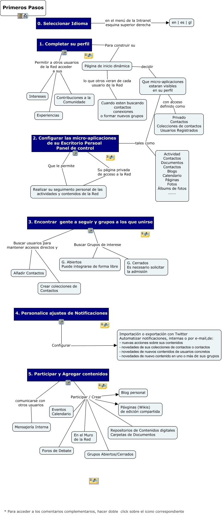 Este mapa conceptual ten información relativa a: Primeros_Pasos_Intranet_AG, Que micro-aplicaciones estaran visibles en su perfil con acceso definido como Privado Contactos Colecciones de contactos Usuarios Registrados, 3. Encontrar gente a seguir y grupos a los que unirse Buscar usuarios para mantener accesos directos y Añadir Contactos, 5. Participar y Agregar contenidos Participar / Crear Páxginas (Wikis) de edición compartida, 3. Encontrar gente a seguir y grupos a los que unirse Buscar usuarios para mantener accesos directos y Crear colecciones de Contactos, 5. Participar y Agregar contenidos Participar / Crear Eventos Calendario, 3. Encontrar gente a seguir y grupos a los que unirse Buscar Grupos de interese G. Abiertos Puede integrarse de forma libre, 2. Configurar las micro-aplicaciones de su Escritorio Persoal Panel de control tales como Actividad Contactos Documentos Contactos Blogs Calendario Páginas Fotos Álbums de fotos ......, 3. Encontrar gente a seguir y grupos a los que unirse Buscar Grupos de interese G. Cerrados Es necesario solicitar la admisión, 5. Participar y Agregar contenidos comunicarse con otros usuarios Mensajería Interna, 5. Participar y Agregar contenidos Participar / Crear Foros de Debate, Página de inicio dinámica decidir Que micro-aplicaciones estaran visibles en su perfil, 5. Participar y Agregar contenidos Participar / Crear Blog personal, Que micro-aplicaciones estaran visibles en su perfil tales como Actividad Contactos Documentos Contactos Blogs Calendario Páginas Fotos Álbums de fotos ......, Página de inicio dinámica lo que otros veran de cada usuario de la Red Cuando esten buscando contactos conexiones o formar nuevos grupos, 1. Completar su perfil Para construir su Página de inicio dinámica, 1. Completar su perfil Permitir a otros usuarios de la Red acceder a sus Experiencias, 2. Configurar las micro-aplicaciones de su Escritorio Persoal Panel de control Que le permite Realizar su seguimento personal de las actividades y contenidos de la Red, 5. Participar y Agregar contenidos Participar / Crear Grupos Abiertos/Cerrados, 5. Participar y Agregar contenidos Participar / Crear En el Muro de la Red, 5. Participar y Agregar contenidos Participar / Crear Repositorios de Contenidos digitales Carpetas de Documentos