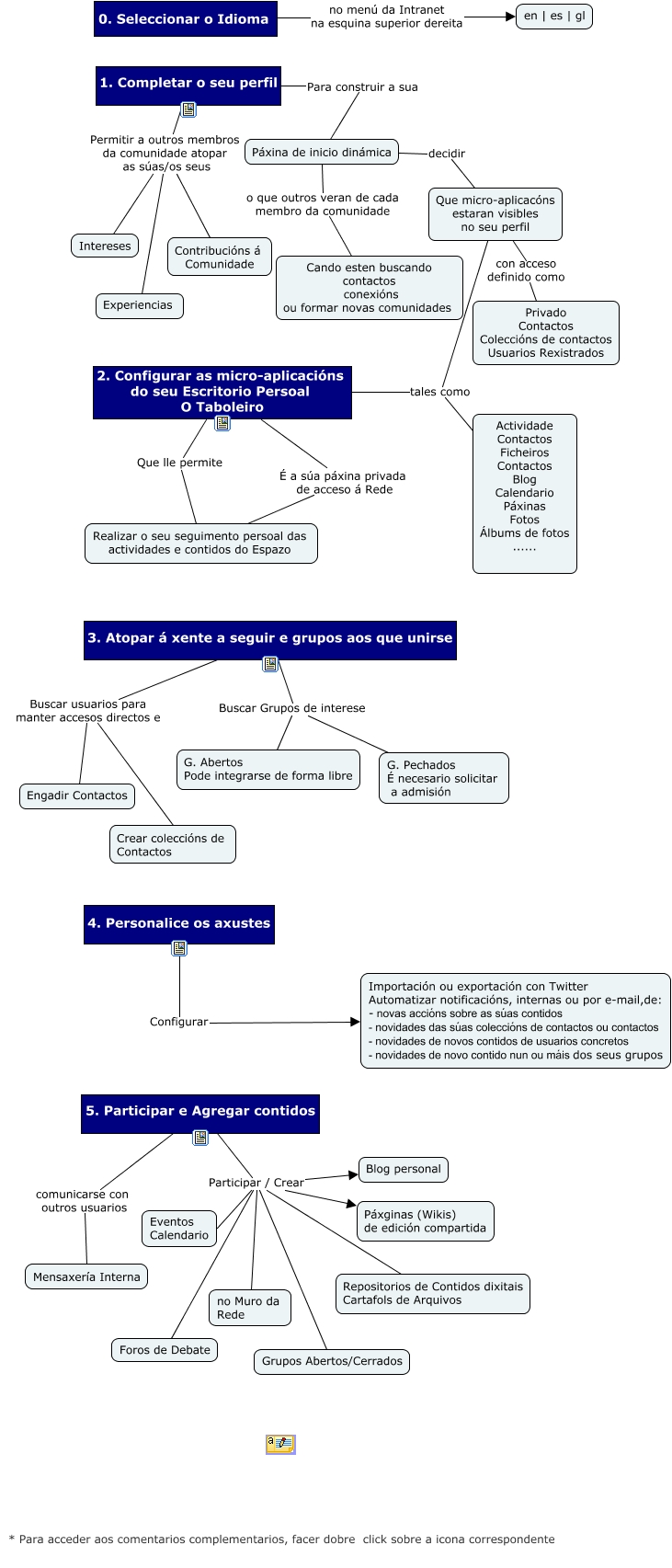 Este mapa conceptual ten información relativa a: Intranet_AG_Primeiros_Pasos, Que micro-aplicacóns estaran visibles no seu perfil con acceso definido como Privado Contactos Coleccións de contactos Usuarios Rexistrados, 3. Atopar á xente a seguir e grupos aos que unirse Buscar usuarios para manter accesos directos e Engadir Contactos, 5. Participar e Agregar contidos Participar / Crear Páxginas (Wikis) de edición compartida, 3. Atopar á xente a seguir e grupos aos que unirse Buscar usuarios para manter accesos directos e Crear coleccións de Contactos, 5. Participar e Agregar contidos Participar / Crear Eventos Calendario, 3. Atopar á xente a seguir e grupos aos que unirse Buscar Grupos de interese G. Abertos Pode integrarse de forma libre, 2. Configurar as micro-aplicacións do seu Escritorio Persoal O Taboleiro tales como Actividade Contactos Ficheiros Contactos Blog Calendario Páxinas Fotos Álbums de fotos ......, 3. Atopar á xente a seguir e grupos aos que unirse Buscar Grupos de interese G. Pechados É necesario solicitar a admisión, 5. Participar e Agregar contidos comunicarse con outros usuarios Mensaxería Interna, 5. Participar e Agregar contidos Participar / Crear Foros de Debate, Páxina de inicio dinámica decidir Que micro-aplicacóns estaran visibles no seu perfil, 5. Participar e Agregar contidos Participar / Crear Blog personal, Que micro-aplicacóns estaran visibles no seu perfil tales como Actividade Contactos Ficheiros Contactos Blog Calendario Páxinas Fotos Álbums de fotos ......, Páxina de inicio dinámica o que outros veran de cada membro da comunidade Cando esten buscando contactos conexións ou formar novas comunidades, 1. Completar o seu perfil Para construir a sua Páxina de inicio dinámica, 1. Completar o seu perfil Permitir a outros membros da comunidade atopar as súas/os seus Experiencias, 2. Configurar as micro-aplicacións do seu Escritorio Persoal O Taboleiro Que lle permite Realizar o seu seguimento persoal das actividades e contidos do Espazo, 5. Participar e Agregar contidos Participar / Crear Grupos Abertos/Cerrados, 5. Participar e Agregar contidos Participar / Crear no Muro da Rede, 5. Participar e Agregar contidos Participar / Crear Repositorios de Contidos dixitais Cartafols de Arquivos