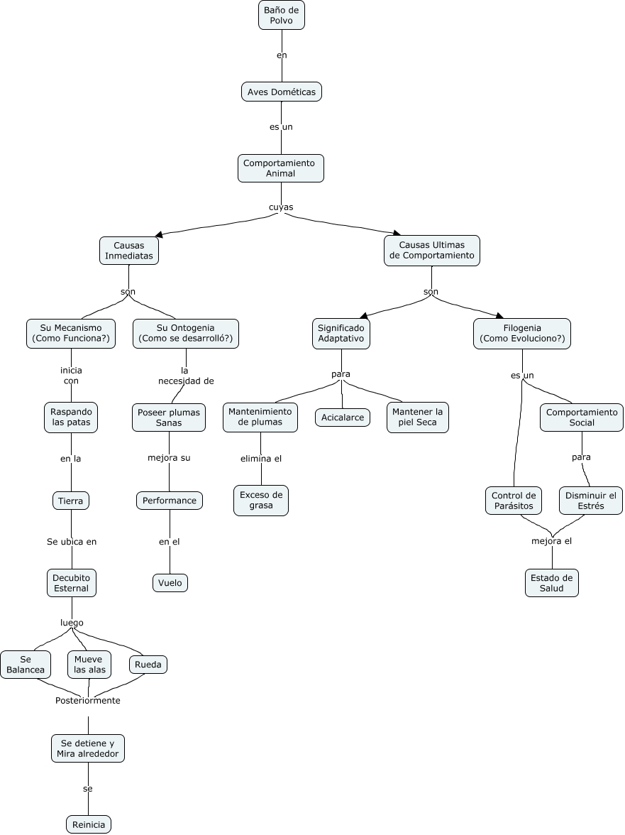 Este Cmap, tiene información relacionada con: Baño de Polvo en las Aves, Raspando las patas en la Tierra, Comportamiento Animal cuyas Causas Inmediatas, Decubito Esternal luego Mueve las alas, Baño de Polvo en Aves Dométicas, Control de Parásitos mejora el Estado de Salud, Decubito Esternal luego Se Balancea, Mueve las alas Posteriormente Se detiene y Mira alrededor, Rueda Posteriormente Se detiene y Mira alrededor, Disminuir el Estrés mejora el Estado de Salud, Significado Adaptativo para Mantenimiento de plumas, Performance en el Vuelo, Significado Adaptativo para Mantener la piel Seca, Aves Dométicas es un Comportamiento Animal, Significado Adaptativo para Acicalarce, Tierra Se ubica en Decubito Esternal, Se detiene y Mira alrededor se Reinicia, Decubito Esternal luego Rueda, Se Balancea Posteriormente Se detiene y Mira alrededor, Comportamiento Animal cuyas Causas Ultimas de Comportamiento, Filogenia (Como Evoluciono?) es un Comportamiento Social