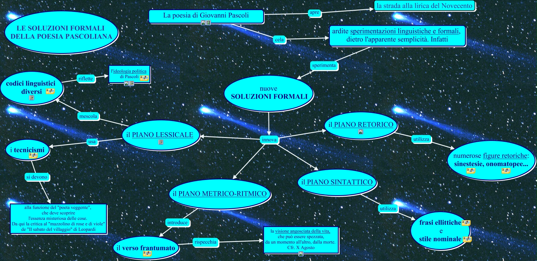Questa Cmap, creata con IHMC CmapTools, contiene informazioni relative a: Le soluzioni formali della poesia pascoliana, il PIANO LESSICALE usa i tecnicismi, il PIANO METRICO-RITMICO introduce il verso frantumato, La poesia di Giovanni Pascoli apre la strada alla lirica del Novecento, nuove SOLUZIONI FORMALI innova il PIANO RETORICO, il PIANO LESSICALE mescola codici linguistici diversi, i tecnicismi si devono alla funzione del "poeta veggente", che deve scoprire l'essenza misteriosa delle cose. Da qui la critica al "mazzolino di rose e di viole" de "Il sabato del villaggio" di Leopardi, nuove SOLUZIONI FORMALI innova il PIANO METRICO-RITMICO, il verso frantumato rispecchia la visione angosciata della vita, che può essere spezzata, da un momento all'altro, dalla morte. Cfr. X Agosto, ardite sperimentazioni linguistiche e formali, dietro l'apparente semplicità. Infatti sperimenta nuove SOLUZIONI FORMALI, nuove SOLUZIONI FORMALI innova il PIANO SINTATTICO, il PIANO SINTATTICO utilizza frasi ellittiche e stile nominale, La poesia di Giovanni Pascoli cela ardite sperimentazioni linguistiche e formali, dietro l'apparente semplicità. Infatti, codici linguistici diversi riflette l'ideologia politica di Pascoli, il PIANO RETORICO utilizza numerose figure retoriche: sinestesie, onomatopee..., nuove SOLUZIONI FORMALI innova il PIANO LESSICALE