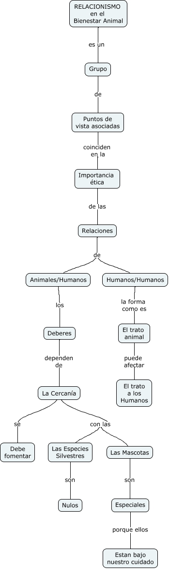Este Cmap, tiene información relacionada con: Relacionismo, Relaciones de Humanos/Humanos, Relaciones de Animales/Humanos, Humanos/Humanos la forma como es El trato animal, El trato animal puede afectar El trato a los Humanos, RELACIONISMO en el Bienestar Animal es un Grupo, Puntos de vista asociadas coinciden en la Importancia ética, Animales/Humanos los Deberes, Las Especies Silvestres son Nulos, Grupo de Puntos de vista asociadas, Importancia ética de las Relaciones, La Cercanía con las Las Especies Silvestres, La Cercanía con las Las Mascotas, Deberes dependen de La Cercanía, La Cercanía se Debe fomentar, Las Mascotas son Especiales, Especiales porque ellos Estan bajo nuestro cuidado