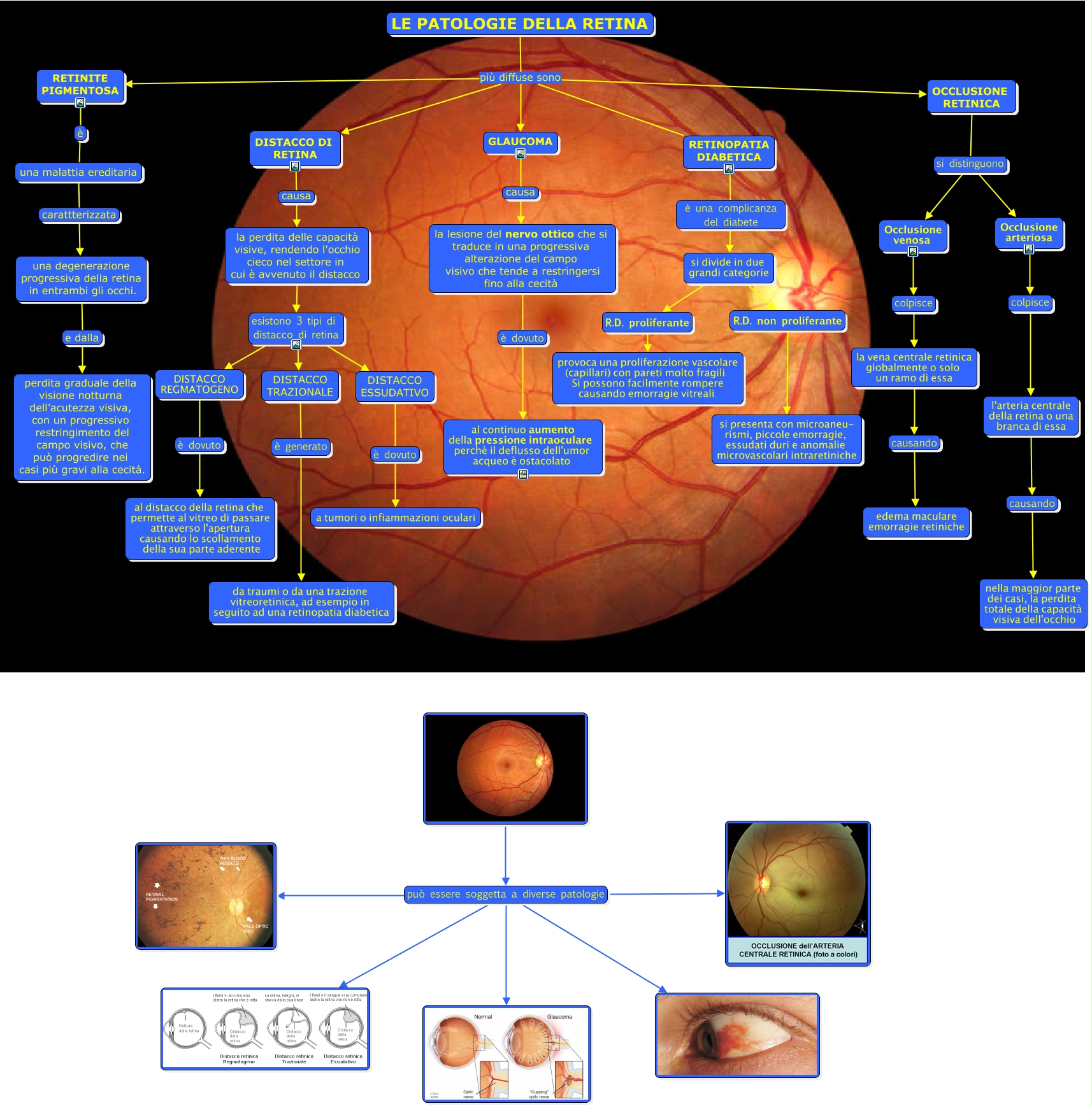 Questa Cmap, creata con IHMC CmapTools, contiene informazioni relative a: Le patologie della retina, si divide in due grandi categorie R.D. non proliferante si presenta con microaneu- rismi, piccole emorragie, essudati duri e anomalie microvascolari intraretiniche, LE PATOLOGIE DELLA RETINA più diffuse sono OCCLUSIONE RETINICA, LE PATOLOGIE DELLA RETINA più diffuse sono RETINITE PIGMENTOSA, DISTACCO REGMATOGENO è dovuto al distacco della retina che permette al vitreo di passare attraverso l'apertura causando lo scollamento della sua parte aderente, la perdita delle capacità visive, rendendo l'occhio cieco nel settore in cui è avvenuto il distacco esistono 3 tipi di distacco di retina DISTACCO REGMATOGENO, la perdita delle capacità visive, rendendo l'occhio cieco nel settore in cui è avvenuto il distacco esistono 3 tipi di distacco di retina DISTACCO TRAZIONALE, la perdita delle capacità visive, rendendo l'occhio cieco nel settore in cui è avvenuto il distacco esistono 3 tipi di distacco di retina DISTACCO ESSUDATIVO, LE PATOLOGIE DELLA RETINA più diffuse sono GLAUCOMA, la lesione del nervo ottico che si traduce in una progressiva alterazione del campo visivo che tende a restringersi fino alla cecità è dovuto al continuo aumento della pressione intraoculare perchè il deflusso dell'umor acqueo è ostacolato, OCCLUSIONE RETINICA si distinguono Occlusione venosa, può essere soggetta a diverse patologie, GLAUCOMA causa la lesione del nervo ottico che si traduce in una progressiva alterazione del campo visivo che tende a restringersi fino alla cecità, OCCLUSIONE RETINICA si distinguono Occlusione arteriosa, una degenerazione progressiva della retina in entrambi gli occhi. e dalla perdita graduale della visione notturna dell’acutezza visiva, con un progressivo restringimento del campo visivo, che può progredire nei casi più gravi alla cecità., DISTACCO ESSUDATIVO è dovuto a tumori o infiammazioni oculari, DISTACCO TRAZIONALE è generato da traumi o da una trazione vitreoretinica, ad esempio in seguito ad una retinopatia diabetica, può essere soggetta a diverse patologie, DISTACCO DI RETINA causa la perdita delle capacità visive, rendendo l'occhio cieco nel settore in cui è avvenuto il distacco, LE PATOLOGIE DELLA RETINA più diffuse sono RETINOPATIA DIABETICA, una malattia ereditaria carattterizzata una degenerazione progressiva della retina in entrambi gli occhi.