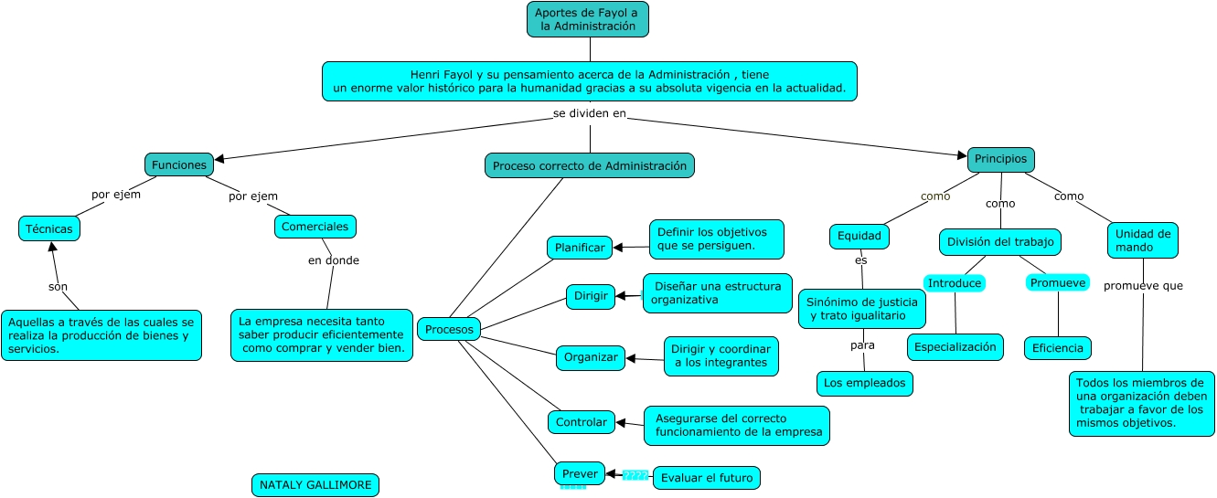 Este Cmap, tiene información relacionada con: Aporte de Fayol, Asegurarse del correcto funcionamiento de la empresa ???? Controlar, Unidad de mando promueve que Todos los miembros de una organización deben trabajar a favor de los mismos objetivos., Evaluar el futuro ???? Prever, Diseñar una estructura organizativa ???? Dirigir, Procesos ???? Controlar, Dirigir ???? Procesos, Procesos ???? Organizar, Principios como División del trabajo, Equidad es Sinónimo de justicia y trato igualitario, Henri Fayol y su pensamiento acerca de la Administración , tiene un enorme valor histórico para la humanidad gracias a su absoluta vigencia en la actualidad. se dividen en Funciones, Definir los objetivos que se persiguen. ???? Planificar, Dirigir y coordinar a los integrantes ???? Organizar, Comerciales en donde La empresa necesita tanto saber producir eficientemente como comprar y vender bien., Sinónimo de justicia y trato igualitario para Los empleados, Funciones por ejem Técnicas, Aquellas a través de las cuales se realiza la producción de bienes y servicios. son Técnicas, Henri Fayol y su pensamiento acerca de la Administración , tiene un enorme valor histórico para la humanidad gracias a su absoluta vigencia en la actualidad. se dividen en Principios, Diseñar una estructura organizativa ???? Dirigir, Procesos ???? Prever, División del trabajo Introduce Especialización
