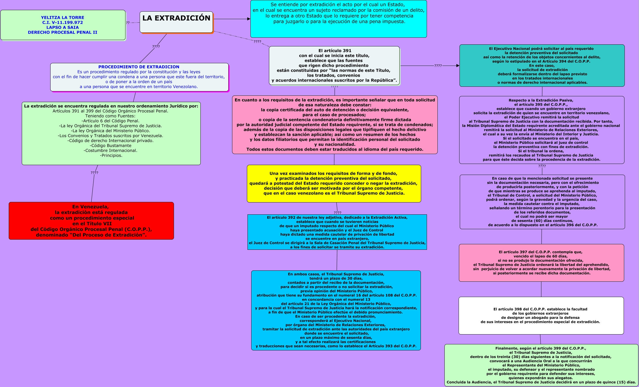 Este Cmap, tiene información relacionada con: LA EXTRADICION, El Ejecutivo Nacional podrá solicitar al país requerido la detención preventiva del solicitado así como la retención de los objetos concernientes al delito, según lo estipulado en el Artículo 394 del C.O.P.P. En este caso, la solicitud de extradición deberá formalizarse dentro del lapso previsto en los tratados internacionales o normas de derecho internacional aplicables. ???? Respecto a la Extradición Pasiva, el artículo 395 del C.O.P.P., establece que cuando un gobierno extranjero solicita la extradición de quien se encuentre en territorio venezolano, el Poder Ejecutivo remitirá la solicitud al Tribunal Supremo de Justicia con la documentación recibida. Por tanto, la Misión Diplomática del Estado requirente acreditada ante el gobierno nacional remitirá la solicitud al Ministerio de Relaciones Exteriores, el cual a su vez la envía al Ministerio del Interior y Justicia. Si el solicitado se encuentra en el país, el Ministerio Público solicitará al juez de control la detención preventiva con fines de extradición. Si el tribunal la ordena, remitirá los recaudos al Tribunal Supremo de Justicia para que éste decida sobre la procedencia de la extradición., Una vez examinados los requisitos de forma y de fondo, y practicada la detención preventiva del solicitado, quedará a potestad del Estado requerido conceder o negar la extradición, decisión que deberá ser motivada por el órgano competente, que en el caso venezolano es el Tribunal Supremo de Justicia. ???? En ambos casos, el Tribunal Supremo de Justicia, tendrá un plazo de 30 días, contados a partir del recibo de la documentación, para decidir si es procedente o no solicitar la extradición, previa opinión del Ministerio Público, atribución que tiene su fundamento en el numeral 16 del artículo 108 del C.O.P.P. en concordancia con el numeral 13 del artículo 21 de la Ley Orgánica del Ministerio Público, y para la cual el Tribunal Supremo de Justicia hará la notificación correspondiente, a fin de que el Ministerio Público efectúe el debido pronunciamiento. En caso de ser procedente la extradición, corresponderá al Ejecutivo Nacional, por órgano del Ministerio de Relaciones Exteriores, tramitar la solicitud de extradición ante las autoridades del país extranjero donde se encuentre el solicitado, en un plazo máximo de sesenta días, y a tal efecto realizará las certificaciones y traducciones que sean necesarias, como lo establece el Artículo 393 del C.O.P.P., En caso de que la mencionada solicitud se presente sin la documentación necesaria, pero con el ofrecimiento de producirla posteriormente, y con la petición de que mientras se produce se aprehenda al imputado, el Tribunal de Control, a solicitud del Ministerio Público, podrá ordenar, según la gravedad y la urgencia del caso, la medida cautelar contra el imputado, señalando un término perentorio para la presentación de los referidos documentos, el cual no podrá ser mayor de sesenta (60) días continuos, de acuerdo a lo dispuesto en el artículo 396 del C.O.P.P. ???? Respecto a la Extradición Pasiva, el artículo 395 del C.O.P.P., establece que cuando un gobierno extranjero solicita la extradición de quien se encuentre en territorio venezolano, el Poder Ejecutivo remitirá la solicitud al Tribunal Supremo de Justicia con la documentación recibida. Por tanto, la Misión Diplomática del Estado requirente acreditada ante el gobierno nacional remitirá la solicitud al Ministerio de Relaciones Exteriores, el cual a su vez la envía al Ministerio del Interior y Justicia. Si el solicitado se encuentra en el país, el Ministerio Público solicitará al juez de control la detención preventiva con fines de extradición. Si el tribunal la ordena, remitirá los recaudos al Tribunal Supremo de Justicia para que éste decida sobre la procedencia de la extradición., LA EXTRADICIÓN ???? PROCEDIMIENTO DE EXTRADICION Es un procedimiento regulado por la constitución y las leyes con el fin de hacer cumplir una condena a una persona que este fuera del territorio, o de poner a la orden de un país a una persona que se encuentre en territorio Venezolano., LA EXTRADICIÓN ???? El artículo 391 con el cual se inicia este título, establece que las fuentes que rigen dicho procedimiento están constituidas por “las normas de este Título, los tratados, convenios y acuerdos internacionales suscritos por la República”., LA EXTRADICIÓN ???? YELITZA LA TORRE C.I. V-11.199.972 LAPSO A SAIA DERECHO PROCESAL PENAL II, El artículo 391 con el cual se inicia este título, establece que las fuentes que rigen dicho procedimiento están constituidas por “las normas de este Título, los tratados, convenios y acuerdos internacionales suscritos por la República”. ???? Una vez examinados los requisitos de forma y de fondo, y practicada la detención preventiva del solicitado, quedará a potestad del Estado requerido conceder o negar la extradición, decisión que deberá ser motivada por el órgano competente, que en el caso venezolano es el Tribunal Supremo de Justicia., La extradición se encuentra regulada en nuestro ordenamiento Jurídico por: Artículos 391 al 399 del Código Orgánico Procesal Penal. Teniendo como Fuentes: -Artículo 6 del Código Penal. -La ley Orgánica del Tribunal Supremo de Justicia. -La ley Orgánica del Ministerio Público. -Los Convenios y Tratados suscritos por Venezuela. -Código de derecho Internacional privado. -Código Bustamante -Costumbre Internacional. -Principios. ???? En Venezuela, la extradición está regulada como un procedimiento especial en el Título VII del Código Orgánico Procesal Penal (C.O.P.P.), denominado “Del Proceso de Extradición”., El artículo 398 del C.O.P.P. establece la facultad de los gobiernos extranjeros de designar un abogado para la defensa de sus intereses en el procedimiento especial de extradición. ???? Finalmente, seg