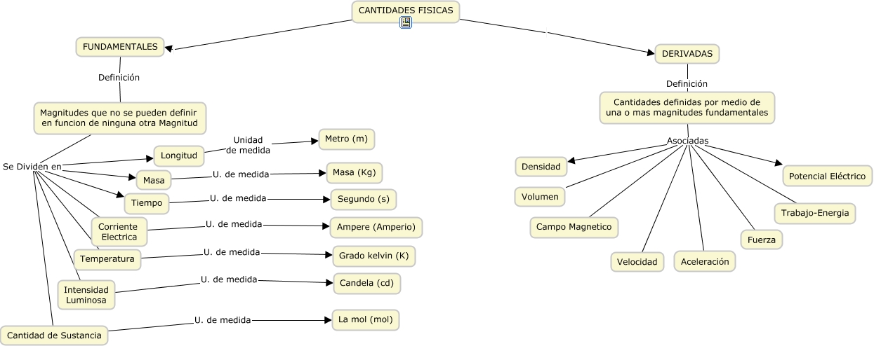 Este Cmap, tiene información relacionada con: Cantidades Fsicas, Cantidades definidas por medio de una o mas magnitudes fundamentales Asociadas Volumen, Magnitudes que no se pueden definir en funcion de ninguna otra Magnitud Se Dividen en Intensidad Luminosa, Cantidades definidas por medio de una o mas magnitudes fundamentales Asociadas Aceleración, Tiempo U. de medida Segundo (s), Cantidades definidas por medio de una o mas magnitudes fundamentales Asociadas Trabajo-Energia, Magnitudes que no se pueden definir en funcion de ninguna otra Magnitud Se Dividen en Longitud, Cantidades definidas por medio de una o mas magnitudes fundamentales Asociadas Densidad, Temperatura U. de medida Grado kelvin (K), Intensidad Luminosa U. de medida Candela (cd), Cantidades definidas por medio de una o mas magnitudes fundamentales Asociadas Potencial Eléctrico, DERIVADAS Definición Cantidades definidas por medio de una o mas magnitudes fundamentales, Magnitudes que no se pueden definir en funcion de ninguna otra Magnitud Se Dividen en Cantidad de Sustancia, CANTIDADES FISICAS FUNDAMENTALES, Masa U. de medida Masa (Kg), Cantidades definidas por medio de una o mas magnitudes fundamentales Asociadas Campo Magnetico, Cantidades definidas por medio de una o mas magnitudes fundamentales Asociadas Velocidad, Cantidades definidas por medio de una o mas magnitudes fundamentales Asociadas Fuerza, Magnitudes que no se pueden definir en funcion de ninguna otra Magnitud Se Dividen en Tiempo, CANTIDADES FISICAS DERIVADAS, FUNDAMENTALES Definición Magnitudes que no se pueden definir en funcion de ninguna otra Magnitud