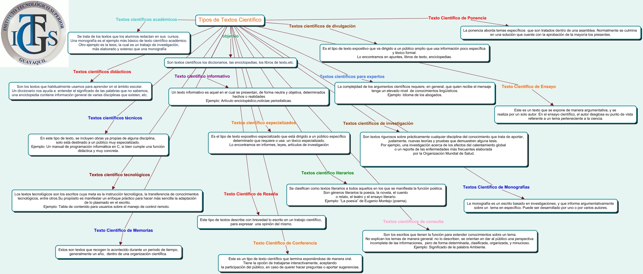 Este Cmap, tiene información relacionada con: deber jaquelin, Tipos de Textos Científico Texto científico informativo Un texto informativo es aquel en el cual se presentan, de forma neutra y objetiva, determinados hechos o realidades Ejemplo: Artículo enciclopédico,noticias periodisticas., Tipos de Textos Científico Textos científicos de divulgación Es el tipo de texto expositivo que va dirigido a un público amplio que usa información poco específica y léxico formal. Lo encontramos en apuntes, libros de texto, enciclopedias., Tipos de Textos Científico Textos científicos técnicos En este tipo de texto, se incluyen obras ya propias de alguna disciplina, solo está destinado a un público muy especializado. Ejemplo: Un manual de programación informática en C, si bien cumple una función didáctica y muy concreta., Tipos de Textos Científico Textos científicos para expertos La complejidad de los argumentos científicos requiere, en general, que quien recibe el mensaje tenga un elevado nivel de conocimientos lingüísticos. Ejemplo: Idioma de los abogados., Tipos de Textos Científico Textos científico tecnológicos Los textos tecnológicos son los escritos cuya meta es la instrucción tecnológica, la transferencia de conocimientos tecnológicos, entre otros.Su propósito es manifestar un enfoque práctico para hacer más sencilla la adaptación de lo plasmado en el escrito. Ejemplo: Tabla de contenido para usuarios sobre el manejo de control remoto., Tipos de Textos Científico Textos científico literarios Se clasifican como textos literarios a todos aquellos en los que se manifiesta la función poética. Son géneros literarios la poesía, la novela, el cuento o relato, el teatro y el ensayo literario. Ejemplo: “La poesía” de Eugenio Montejo (poema)., Tipos de Textos Científico Textos científicos de investigación Son textos rigurosos sobre prácticamente cualquier disciplina del conocimiento que trata de aportar, justamente, nuevas teorías y pruebas que demuestren alguna tesis. Por ejemplo, una investigación acerca de los efectos del calentamiento global o un reporte de las enfermedades más frecuentes elaborada por la Organización Mundial de Salud., Tipos de Textos Científico Texto Cientifico de Memorias Estos son textos que recogen lo acontecido durante un periodo de tiempo, generalmente un año, dentro de una organización científica., Tipos de Textos Científico Textos científicos académicos Se trata de los textos que los alumnos redactan en sus cursos. Una monografía es el ejemplo más básico de texto científico académico. Otro ejemplo es la tesis, la cual es un trabajo de investigación, más elaborado y extenso que una monografía, Tipos de Textos Científico Texto Cientifico de Ponencia La ponencia aborda temas específicos que son tratados dentro de una asamblea. Normalmente se culmina en una solución que cuente con la aprobación de la mayoría los presentes., Tipos de Textos Científico Texto Cientifico de Reseña Este tipo de textos describe con brevedad lo escrito en un trabajo científico, para expresar una opinión del mismo., Tipos de Textos Científico Texto Cientifico de Conferencia Este es un tipo de texto científico que termina exponiéndose de manera oral. Tiene la opción de trabajarse interactivamente, aceptando la participación del público, en caso de querer hacer preguntas o aportar sugerencias., Tipos de Textos Científico Textos científico especializados Es el tipo de texto expositivo especializado que está dirigido a un público específico determinado que requiere o usa un léxico especializado. Lo encontramos en informes, leyes, artículos de investigación, Tipos de Textos Científico Textos Cientifico de Monografías La monografía es un escrito basado en investigaciones, y que informa argumentativamente sobre un tema en específico. Puede ser desarrollado por uno o por varios autores., Tipos de Textos Científico Textos científicos didácticos Son los textos que habitualmente usamos para aprender en el ámbito escolar. Un diccionario nos ayuda a entender el significado de las palabras que no sabemos, una enciclopedia contiene información general de varias disciplinas que existen, etc., Tipos de Textos Científico objetivo Son textos científicos los diccionarios, las enciclopedias, los libros de texto,etc., Tipos de Textos Científico Textos científicos de consulta Son los escritos que tienen la función para extender conocimientos sobre un tema. No explican los temas de manera general: no lo describen, se orientan en dar al público una perspectiva incompleta de las informaciones, pero de forma determinada, clasificada, organizada, y minucioso. Ejemplo: Significado de la palabra Ambiente., Tipos de Textos Científico Texto Cientifico de Ensayo Este es un texto que se expone de manera argumentativa, y se realiza por un solo autor. En el ensayo científico, el autor desglosa su punto de vista referente a un tema perteneciente a la ciencia.