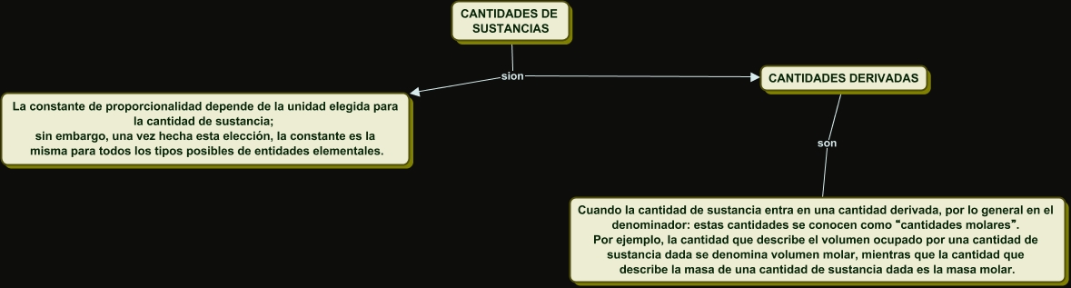 Este Cmap, tiene información relacionada con: cantidades M, CANTIDADES DE SUSTANCIAS sion La constante de proporcionalidad depende de la unidad elegida para la cantidad de sustancia; sin embargo, una vez hecha esta elección, la constante es la misma para todos los tipos posibles de entidades elementales., CANTIDADES DERIVADAS son Cuando la cantidad de sustancia entra en una cantidad derivada, por lo general en el denominador: estas cantidades se conocen como “cantidades molares”. Por ejemplo, la cantidad que describe el volumen ocupado por una cantidad de sustancia dada se denomina volumen molar, mientras que la cantidad que describe la masa de una cantidad de sustancia dada es la masa molar., CANTIDADES DE SUSTANCIAS sion CANTIDADES DERIVADAS