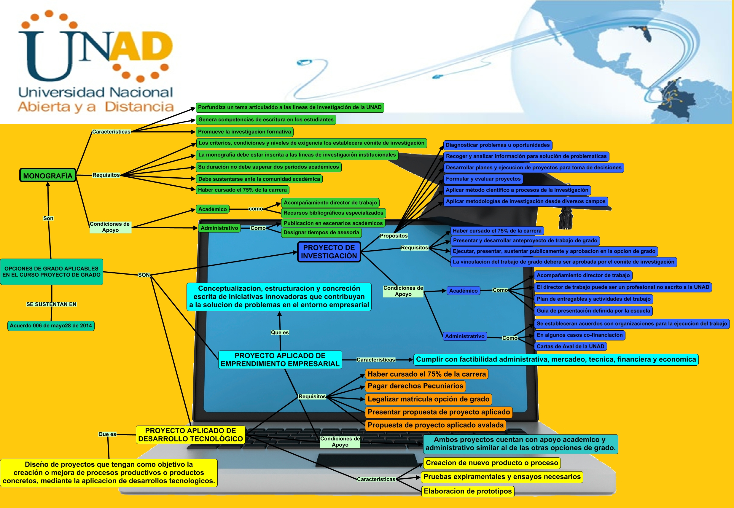 Este Cmap, tiene información relacionada con: Opciones de Grado.cmap, PROYECTO DE INVESTIGACIÓN Propositos Recoger y analizar información para solución de problematicas, PROYECTO DE INVESTIGACIÓN Condiciones de Apoyo Académico, OPCIONES DE GRADO APLICABLES EN EL CURSO PROYECTO DE GRADO SON PROYECTO APLICADO DE EMPRENDIMIENTO EMPRESARIAL, PROYECTO APLICADO DE DESARROLLO TECNOLÓGICO Requisitos Haber cursado el 75% de la carrera, PROYECTO APLICADO DE DESARROLLO TECNOLÓGICO Que es Diseño de proyectos que tengan como objetivo la creación o mejora de procesos productivos o productos concretos, mediante la aplicacion de desarrollos tecnologicos., MONOGRAFÍA Caracteristicas Genera competencias de escritura en los estudiantes, PROYECTO DE INVESTIGACIÓN Requisitos Presentar y desarrollar anteproyecto de trabajo de grado, PROYECTO DE INVESTIGACIÓN Propositos Desarrollar planes y ejecucion de proyectos para toma de decisiones, Administratrivo Como Se estableceran acuerdos con organizaciones para la ejecucion del trabajo, PROYECTO APLICADO DE EMPRENDIMIENTO EMPRESARIAL Que es Conceptualizacion, estructuracion y concreción escrita de iniciativas innovadoras que contribuyan a la solucion de problemas en el entorno empresarial, MONOGRAFÍA Requisitos Su duración no debe superar dos periodos académicos, OPCIONES DE GRADO APLICABLES EN EL CURSO PROYECTO DE GRADO SON PROYECTO DE INVESTIGACIÓN, Académico como Acompañamiento director de trabajo, PROYECTO DE INVESTIGACIÓN Condiciones de Apoyo Administratrivo, MONOGRAFÍA Condiciones de Apoyo Académico, PROYECTO APLICADO DE DESARROLLO TECNOLÓGICO Caracteristicas Elaboracion de prototipos, PROYECTO APLICADO DE DESARROLLO TECNOLÓGICO Requisitos Legalizar matricula opción de grado, Académico Como Acompañamiento director de trabajo, PROYECTO APLICADO DE EMPRENDIMIENTO EMPRESARIAL Condiciones de Apoyo Ambos proyectos cuentan con apoyo academico y administrativo similar al de las otras opciones de grado., PROYECTO APLICADO DE EMPRENDIMIENTO EMPRESARIAL Requisitos Presentar propuesta de proyecto aplicado