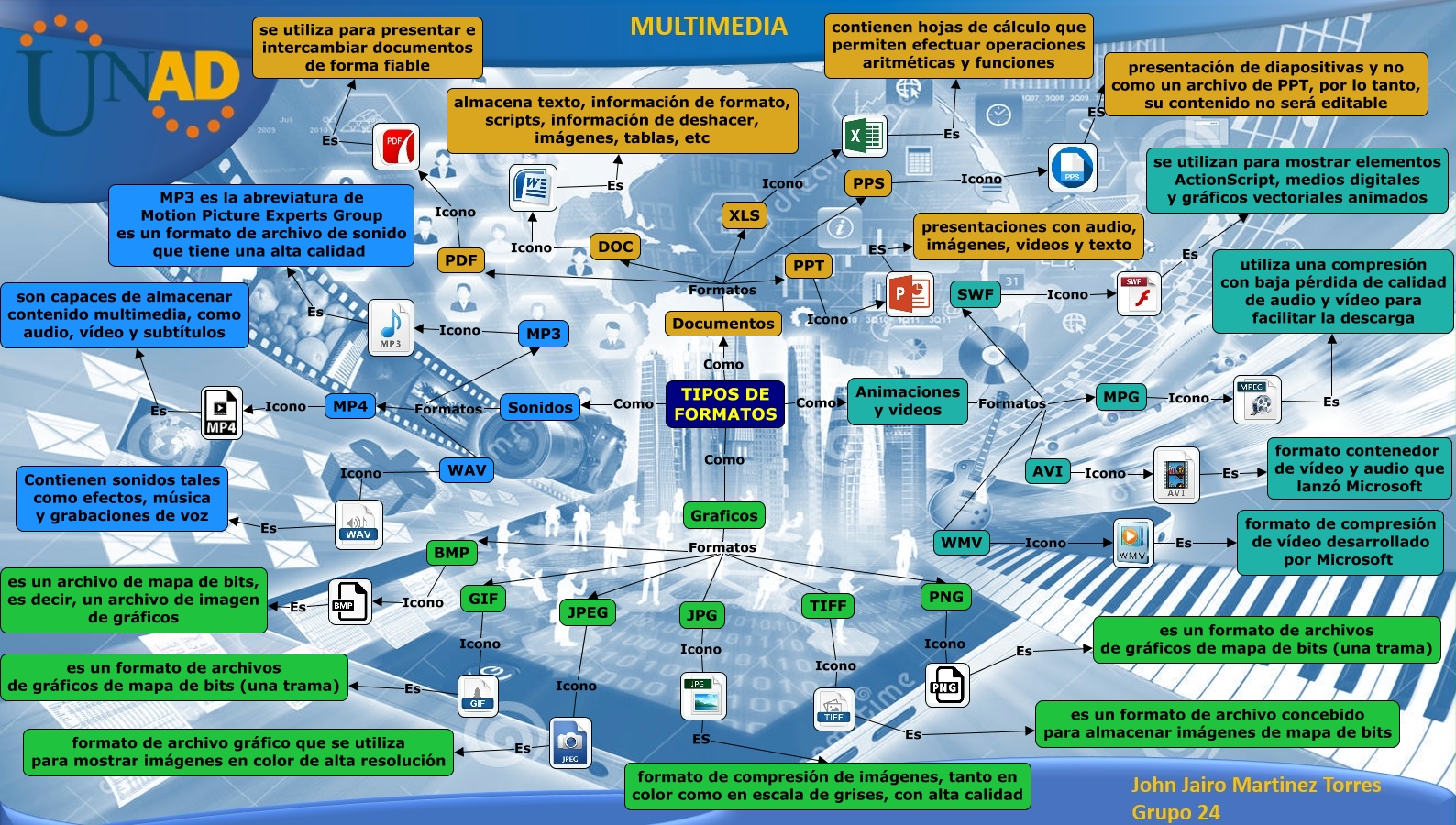 Este Cmap, tiene información relacionada con: Tipos Formatos, Es es un archivo de mapa de bits, es decir, un archivo de imagen de gráficos, Sonidos Formatos WAV, Es contienen hojas de cálculo que permiten efectuar operaciones aritméticas y funciones, TIPOS DE FORMATOS Como Animaciones y videos, Es utiliza una compresión con baja pérdida de calidad de audio y vídeo para facilitar la descarga, DOC Icono, TIPOS DE FORMATOS Como Sonidos, XLS Icono, PDF Icono, Es formato de compresión de vídeo desarrollado por Microsoft, MP4 Icono, Es es un formato de archivos de gráficos de mapa de bits (una trama), Es es un formato de archivo concebido para almacenar imágenes de mapa de bits, PNG Icono, ES presentación de diapositivas y no como un archivo de PPT, por lo tanto, su contenido no será editable, JPG Icono, BMP Icono, TIFF Icono, SWF Icono, GIF Icono