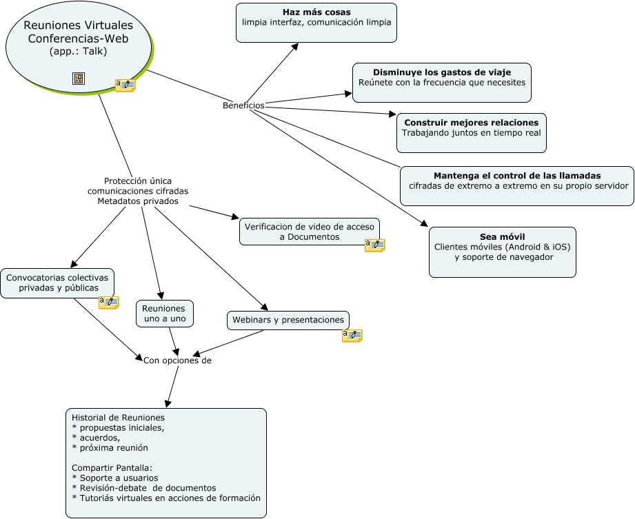 Este Cmap, tiene información relacionada con: Primeros_Pasos_Talk, Reuniones Virtuales Conferencias-Web (app.: Talk) Protección única comunicaciones cifradas Metadatos privados Reuniones uno a uno, Reuniones Virtuales Conferencias-Web (app.: Talk) Beneficios Mantenga el control de las llamadas cifradas de extremo a extremo en su propio servidor, Reuniones Virtuales Conferencias-Web (app.: Talk) Beneficios Construir mejores relaciones Trabajando juntos en tiempo real, Reuniones Virtuales Conferencias-Web (app.: Talk) Beneficios Disminuye los gastos de viaje Reúnete con la frecuencia que necesites, Reuniones Virtuales Conferencias-Web (app.: Talk) Protección única comunicaciones cifradas Metadatos privados Webinars y presentaciones, Reuniones Virtuales Conferencias-Web (app.: Talk) Beneficios Sea móvil Clientes móviles (Android & iOS) y soporte de navegador, Reuniones Virtuales Conferencias-Web (app.: Talk) Protección única comunicaciones cifradas Metadatos privados Convocatorias colectivas privadas y públicas, Reuniones uno a uno Con opciones de Historial de Reuniones * propuestas iniciales, * acuerdos, * próxima reunión Compartir Pantalla: * Soporte a usuarios * Revisión-debate de documentos * Tutoriás virtuales en acciones de formación, Reuniones Virtuales Conferencias-Web (app.: Talk) Beneficios Haz más cosas limpia interfaz, comunicación limpia, Reuniones Virtuales Conferencias-Web (app.: Talk) Protección única comunicaciones cifradas Metadatos privados Verificacion de video de acceso a Documentos, Convocatorias colectivas privadas y públicas Con opciones de Historial de Reuniones * propuestas iniciales, * acuerdos, * próxima reunión Compartir Pantalla: * Soporte a usuarios * Revisión-debate de documentos * Tutoriás virtuales en acciones de formación, Webinars y presentaciones Con opciones de Historial de Reuniones * propuestas iniciales, * acuerdos, * próxima reunión Compartir Pantalla: * Soporte a usuarios * Revisión-debate de documentos * Tutoriás virtuales en acciones de formación