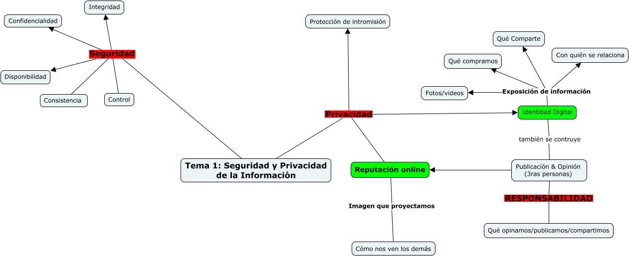 Este Cmap, tiene información relacionada con: Tema1 Seguridad y Privacidad de la Información, Tema 1: Seguridad y Privacidad de la Información Privacidad Reputación online, Tema 1: Seguridad y Privacidad de la Información Seguridad Integridad, Tema 1: Seguridad y Privacidad de la Información Privacidad Protección de intromisión, Reputación online Imagen que proyectamos Cómo nos ven los demás, Publicación & Opinión (3ras personas) RESPONSABILIDAD Qué opinamos/publicamos/compartimos, Tema 1: Seguridad y Privacidad de la Información Seguridad Control, Identidad Digital Exposición de información Qué compramos, Publicación & Opinión (3ras personas) ???? Reputación online, Tema 1: Seguridad y Privacidad de la Información Privacidad Identidad Digital, Tema 1: Seguridad y Privacidad de la Información Seguridad Disponibilidad, Identidad Digital Exposición de información Fotos/videos, Identidad Digital también se contruye Publicación & Opinión (3ras personas), Identidad Digital Exposición de información Qué Comparte, Identidad Digital Exposición de información Con quién se relaciona, Tema 1: Seguridad y Privacidad de la Información Seguridad Confidencialidad, Tema 1: Seguridad y Privacidad de la Información Seguridad Consistencia