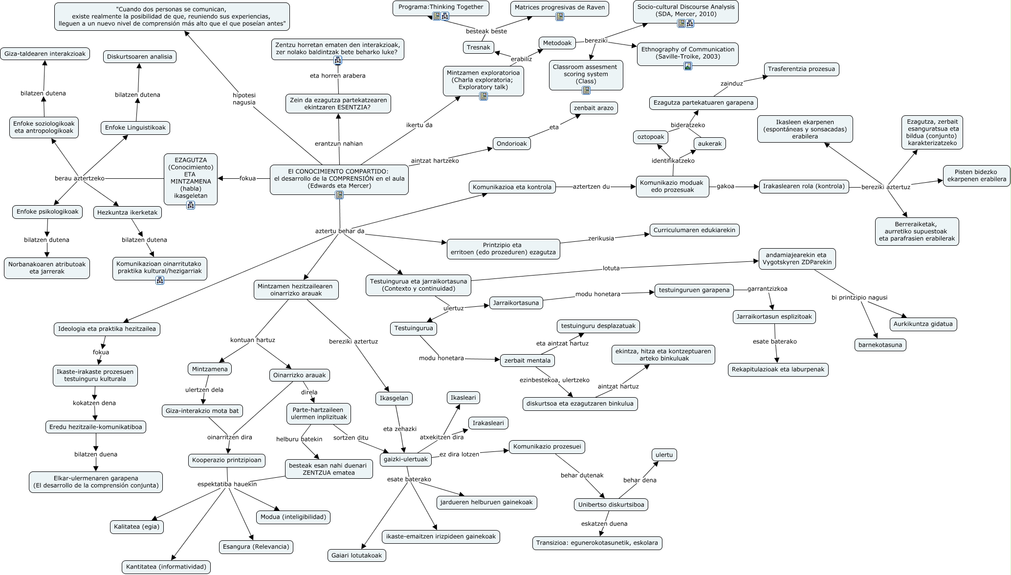 Este Cmap, tiene información relacionada con: Ezagutza partekatua, Kooperazio printzipioan espektatiba hauekin Kantitatea (informatividad), El CONOCIMIENTO COMPARTIDO: el desarrollo de la COMPRENSIÓN en el aula (Edwards eta Mercer) aztertu behar da Komunikazioa eta kontrola, Testuingurua eta jarraikortasuna (Contexto y continuidad) ulertuz Jarraikortasuna, gaizki-ulertuak esate baterako ikaste-emaitzen irizpideen gainekoak, Komunikazio moduak edo prozesuak identifikatzeko aukerak, besteak esan nahi duenari ZENTZUA ematea espektatiba hauekin Esangura (Relevancia), El CONOCIMIENTO COMPARTIDO: el desarrollo de la COMPRENSIÓN en el aula (Edwards eta Mercer) aztertu behar da Ideologia eta praktika hezitzailea, Printzipio eta erritoen (edo prozeduren) ezagutza zerikusia Curriculumaren edukiarekin, El CONOCIMIENTO COMPARTIDO: el desarrollo de la COMPRENSIÓN en el aula (Edwards eta Mercer) aztertu behar da Mintzamen hezitzailearen oinarrizko arauak, EZAGUTZA (Conocimiento) ETA MINTZAMENA (habla) ikasgeletan berau aztertzeko Enfoke psikologikoak, gaizki-ulertuak ez dira lotzen Komunikazio prozesuei, Irakaslearen rola (kontrola) bereziki aztertuz Berreraiketak, aurretiko supuestoak eta parafrasien erabilerak, Tresnak besteak beste Matrices progresivas de Raven, Metodoak bereziki Socio-cultural Discourse Analysis (SDA, Mercer, 2010), andamiajearekin eta Vygotskyren ZDParekin bi printzipio nagusi Aurkikuntza gidatua, Enfoke psikologikoak bilatzen dutena Norbanakoaren atributoak eta jarrerak, Mintzamen hezitzailearen oinarrizko arauak kontuan hartuz Mintzamena, Testuingurua modu honetara zerbait mentala, Komunikazio prozesuei behar dutenak Unibertso diskurtsiboa, testuinguruen garapena garrantzizkoa Jarraikortasun esplizitoak